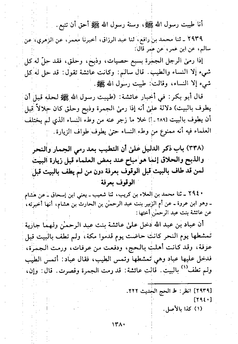 (338) بَابُ ذِكْرِ الدَّلِيلِ عَلَى أَنَّ التَّطَيُّبَ بَعْدَ رَمْيِ الْجِمَارِ وَالنَّحْرِ وَالذَّبْحِ وَالْحِلَاقِ إِنَّمَا هُوَ مُبَاحٌ عِنْدَ بَعْضِ الْعُلَمَاءِ قَبْلَ زِيَارَةِ الْبَيْتِ لِمَنْ قَدْ طَافَ بِالْبَيْتِ قَبْلَ الْوُقُوفِ بِعَرَفَةَ دُونَ مَنْ لَمْ يَطُفْ بِالْبَيْتِ قَبْلَ الْوُقُوفِ بِعَرَفَةَ
