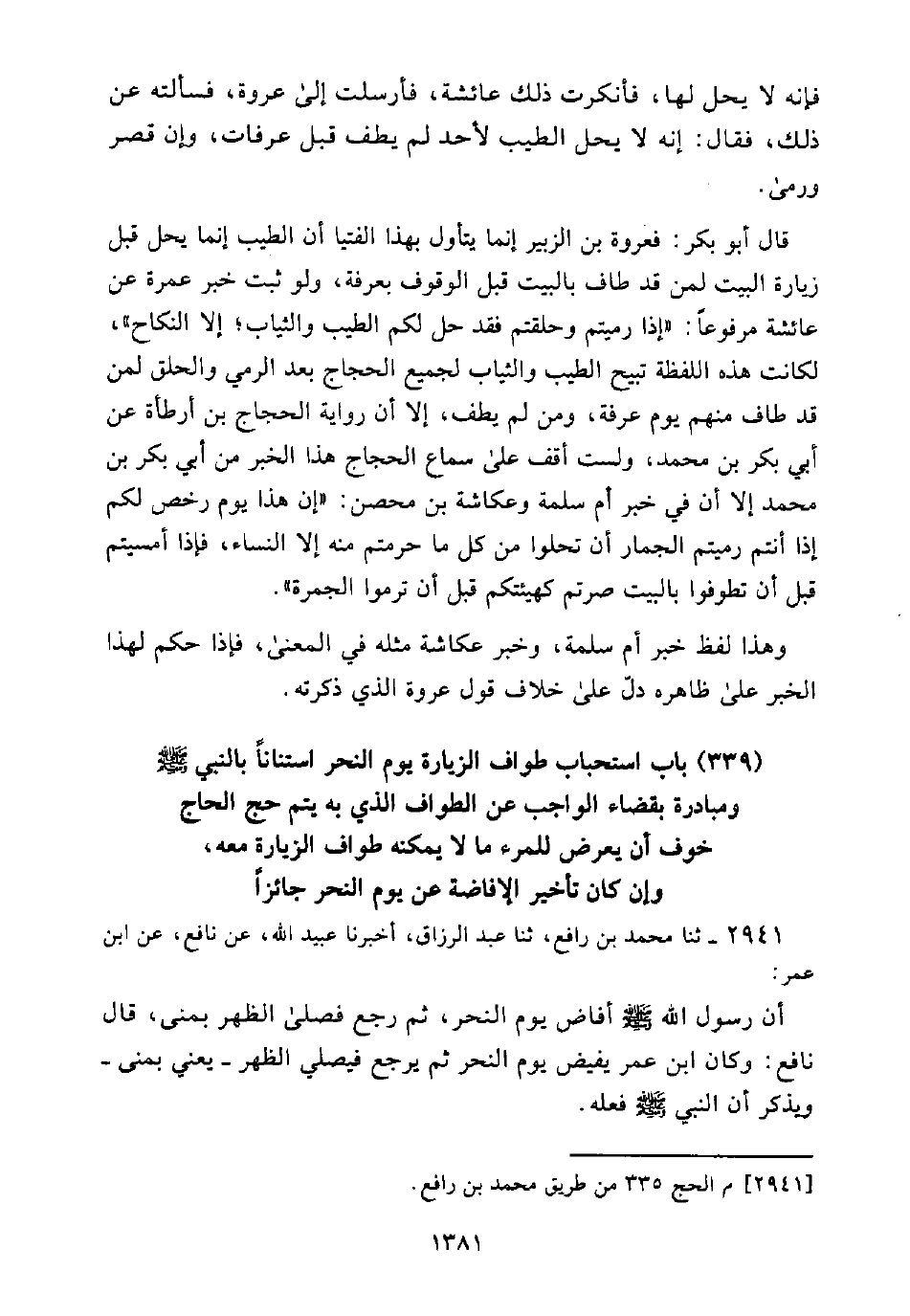 (339) بَابُ اسْتِحْبَابِ طَوَافِ الزِّيَارَةِ يَوْمَ النَّحْرِ اسْتِنَانًا بِالنَّبِيِّ - صَلَّى اللَّهُ عَلَيْهِ وَسَلَّمَ - وَمُبَادَرَةً بِقَضَاءِ الْوَاجِبِ عَنِ الطَّوَافِ الَّذِي بِهِ يَتِمُّ حَجُّ الْحَاجِّ خَوْفَ أَنْ يَعْرِضَ لِلْمَرْءِ مَا لَا يُمْكِنُهُ طَوَافُ الزِّيَارَةِ مَعَهُ، وَإِنْ كَانَ تَأْخِيرُ الْإِفَاضَةِ عَنْ يَوْمِ النَّحْرِ جَائِزًا
