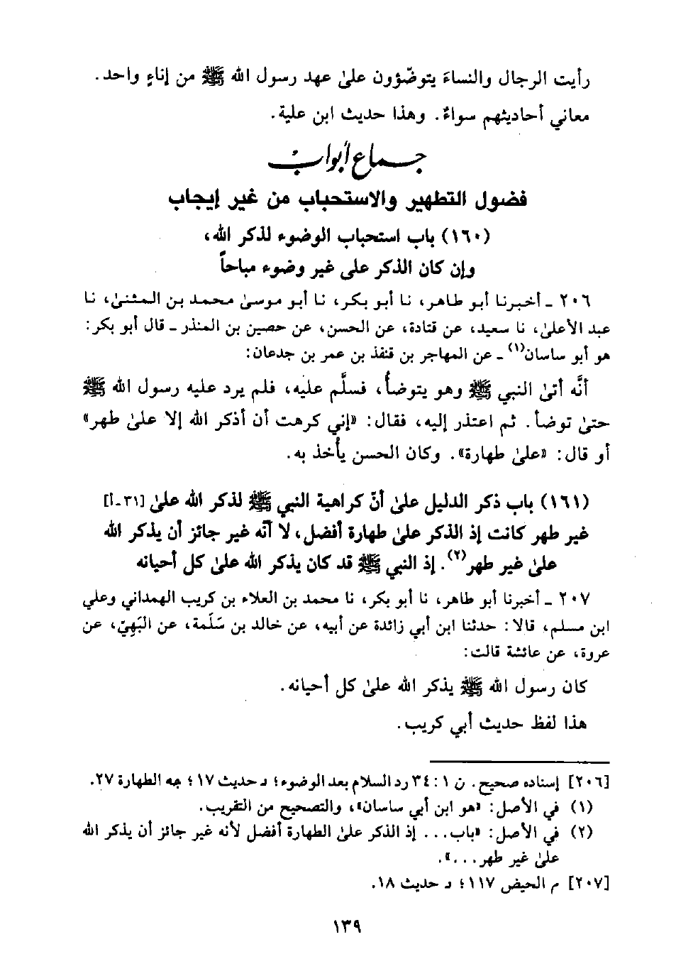 (160) بَابُ اسْتِحْبَابِ الْوُضُوءِ لِذِكْرِ اللَّهِ، وَإِنْ كَانَ الذِّكْرُ عَلَى غَيْرِ وُضُوءٍ مُبَاحًا