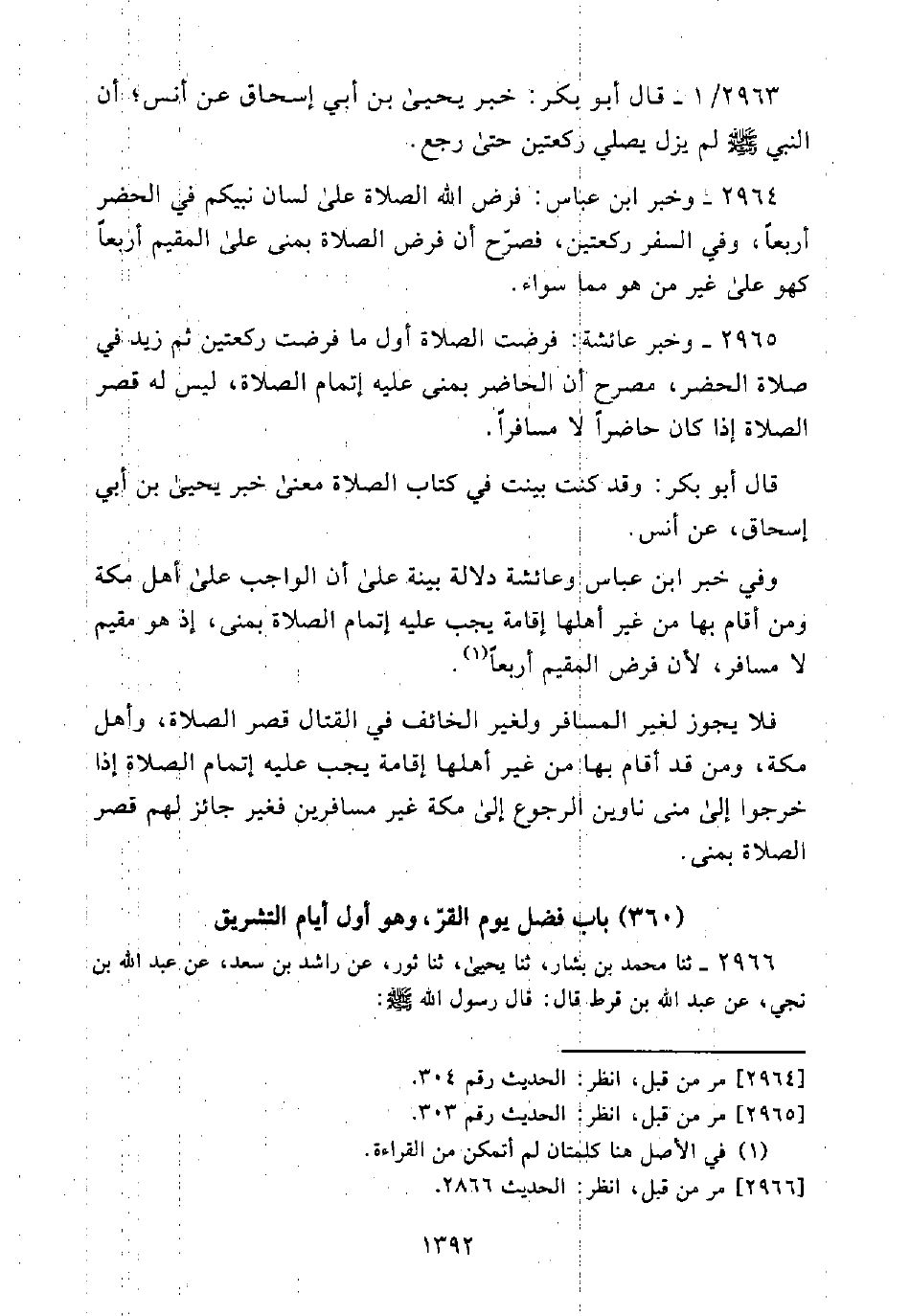 2965 - وَخَبَرُ عَائِشَةَ: فُرِضَتِ الصَّلَاةُ أَوَّلَ مَا فُرِضَتْ رَكْعَتَيْنِ ثُمَّ زِيدَ فِي صَلَاةِ الْحَضَرِ، مُصَرِّحٌ أَنَّ الْحَاضِرَ بِمِنًى عَلَيْهِ إِتْمَامُ الصَّلَاةِ، لَيْسَ لَهُ قَصْرُ الصَّلَاةِ إِذَا كَانَ حَاضِرًا لَا مُسَافِرًا.
