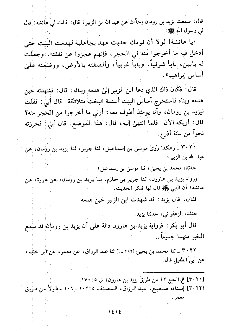 قَالَ: فَكَانَ ذَاكَ الَّذِي دَعَا ابْنُ الزُّبَيْرِ إِلَى هَدْمِهِ وَبِنَائِهِ. قَالَ: فَشَهِدْتُهُ حِينَ هَدْمَهُ وَبَنَاهُ فَاسْتَخْرَجَ أَسَاسَ الْبَيْتِ كَأَسْنِمَةِ الْبُخْتِ مَتَلَائِكَةً. قَالَ أَبِي: فَقُلْتُ لَيَزِيدَ بْنِ رُومَانَ، وَأَنَا يَوْمَئِذٍ أَطُوفُ مَعَهُ: أَرِنِي مَا أَخْرَجُوا مِنَ الْحِجْرِ مِنْهُ؟ قَالَ: أُرِيكَهُ الْآنَ. فَلَمَّا انْتَهَى إِلَيْهِ، قَالَ: هَذَا الْمَوْضِعُ. قَالَ أَبِي: فَحَرَزْتُهُ نَحْوًا مِنْ سِتَّةِ أَذْرُعٍ.