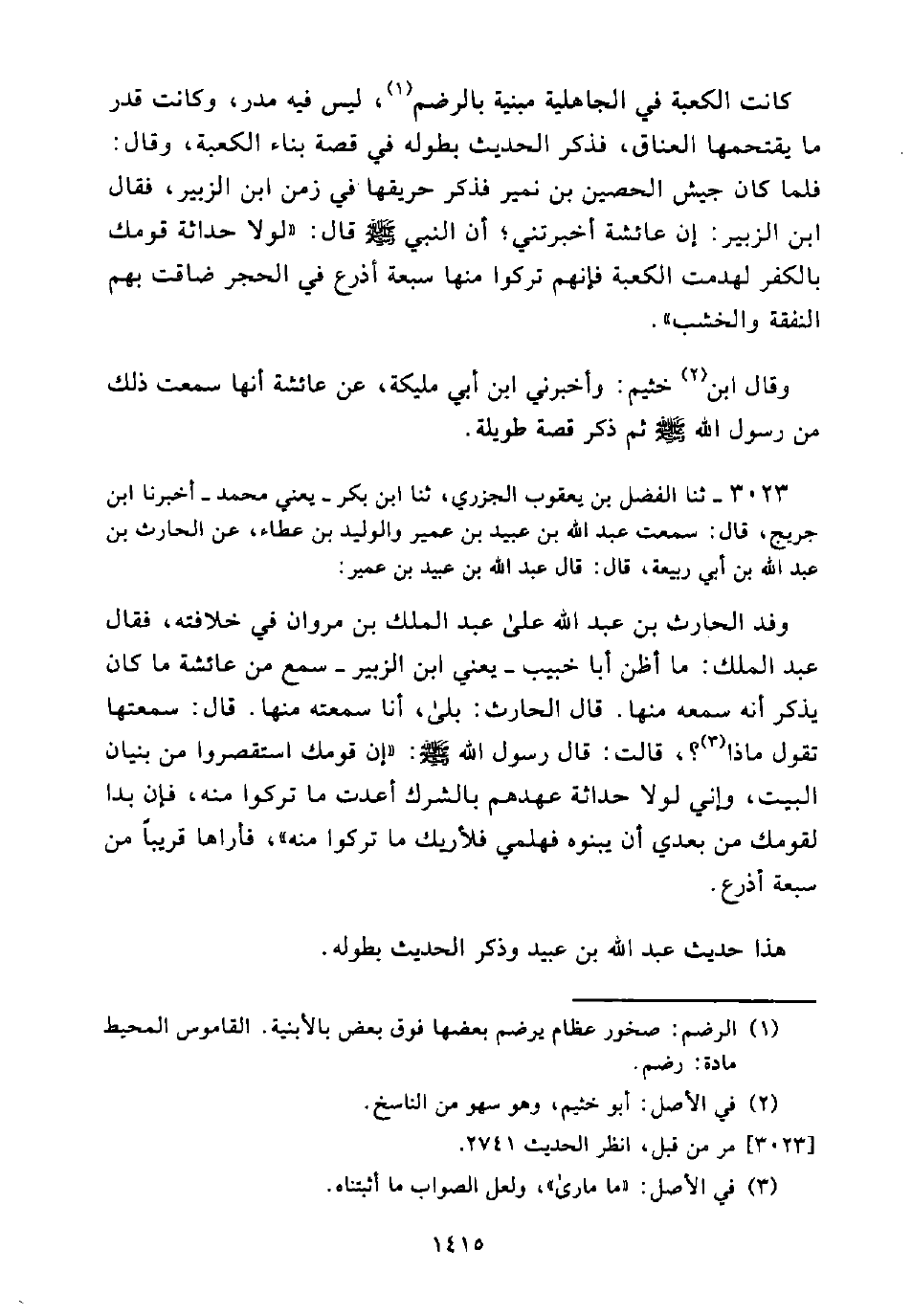 كَانَتِ الْكَعْبَةُ فِي الْجَاهِلِيَّةِ مَبْنِيَّةً بِالرَّضْمِ (¬1)، لَيْسَ فِيهِ مَدَرٌ، وَكَانَتْ قَدْرُ مَا يَقْتَحِمُهَا الْعَنَاقُ، فَذَكَرَ الْحَدِيثَ بِطُولِهِ فِي قِصَّةِ بِنَاءِ الْكَعْبَةِ، وَقَالَ: فَلَمَّا كَانَ جَيْشُ الْحُصَيْنِ بْنِ نُمَيْرٍ فَذَكَرَ حَرِيقَهَا فِي زَمَنِ ابْنِ الزُّبَيْرِ، فَقَالَ ابْنُ الزُّبَيْرِ: إِنَّ عَائِشَةَ أَخْبَرَتْنِي؛ أَنَّ النَّبِيَّ - صَلَّى اللَّهُ عَلَيْهِ وَسَلَّمَ - قَالَ: "لَوْلَا حَدَاثَةُ قَوْمِكِ بِالْكُفْرِ لَهَدَمْتُ الْكَعْبَةَ فَإِنَّهُمْ تَرَكُوا مِنْهَا سَبْعَةَ أَذْرُعٍ فِي الْحِجْرِ ضَاقَتْ بِهِمُ النَّفَقَةُ وَالْخَشَبُ".