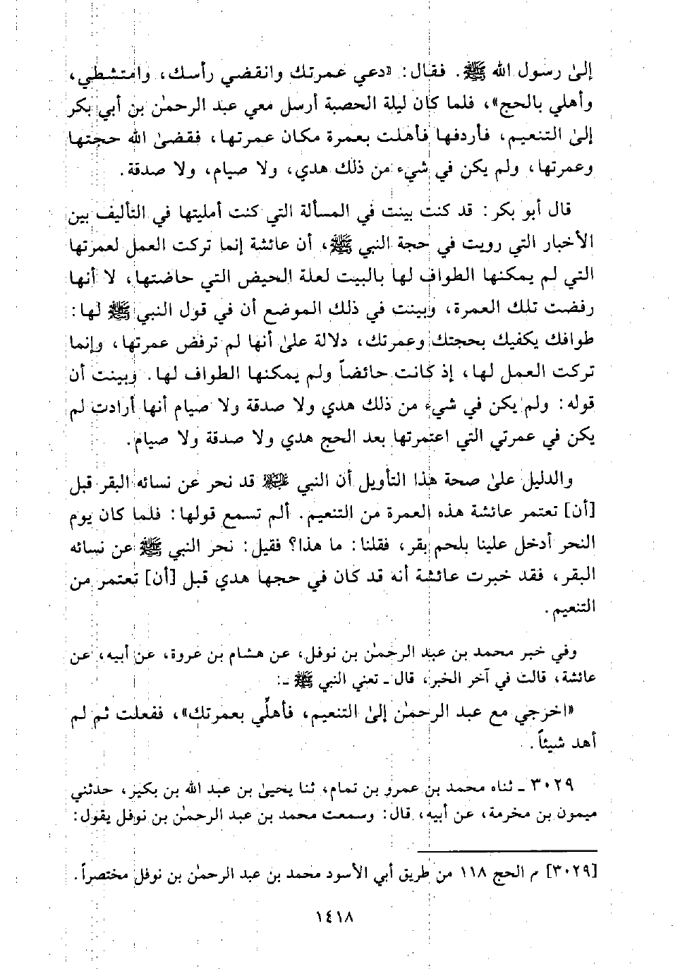 وَالدَّلِيلُ عَلَى صِحَّةِ هَذَا التَّأْوِيلِ أَنَّ النَّبِيَّ - صَلَّى اللَّهُ عَلَيْهِ وَسَلَّمَ - قَدْ نَحَرَ عَنْ نِسَائِهِ الْبَقَرَ قَبْلَ [أَنْ] تَعْتَمِرَ عَائِشَةُ هَذِهِ الْعُمْرَةَ مِنَ التَّنْعِيمِ. أَلَمْ تَسْمَعْ قَوْلَهَا: فَلَمَّا كَانَ يَوْمُ النَّحْرِ أُدْخِلَ عَلَيْنَا بِلَحْمِ بَقَرٍ، فَقُلْنَا: مَا هَذَا؟ فَقِيلَ: نَحَرَ النَّبِيُّ - صَلَّى اللَّهُ عَلَيْهِ وَسَلَّمَ - عَنْ نِسَائِهِ الْبَقَرَ، فَقَدْ خَبَّرَتْ عَائِشَةُ أَنَّهُ قَدْ كَانَ فِي حَجِّهَا هَدْيٌ قَبْلَ [أَنْ] تَعْتَمِرَ مِنَ التَّنْعِيمِ.