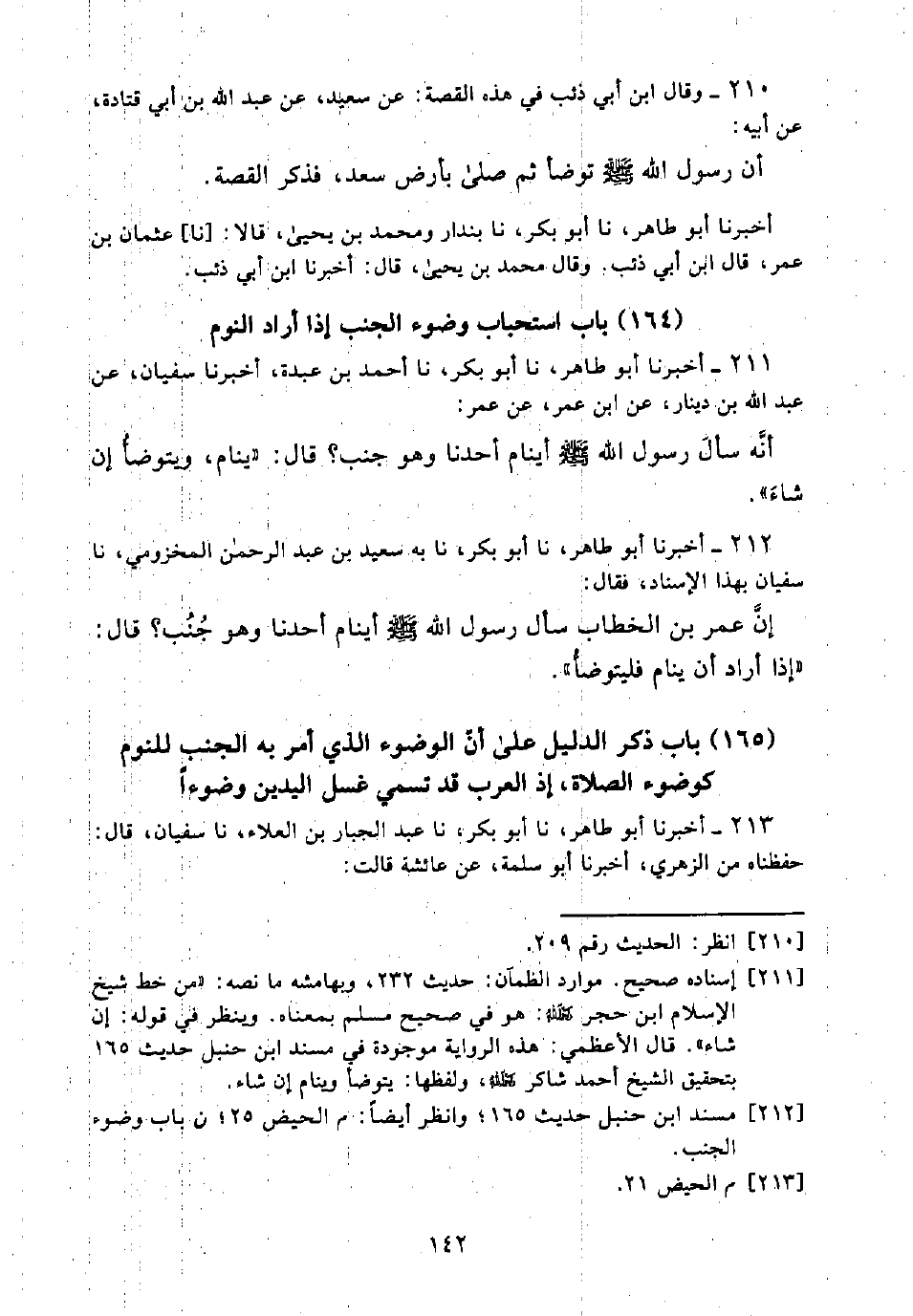 [212] مسند ابن حنبل حديث 165؛ وانظر أيضًا: م الحيض 25؛ ن باب وضوء الجنب.