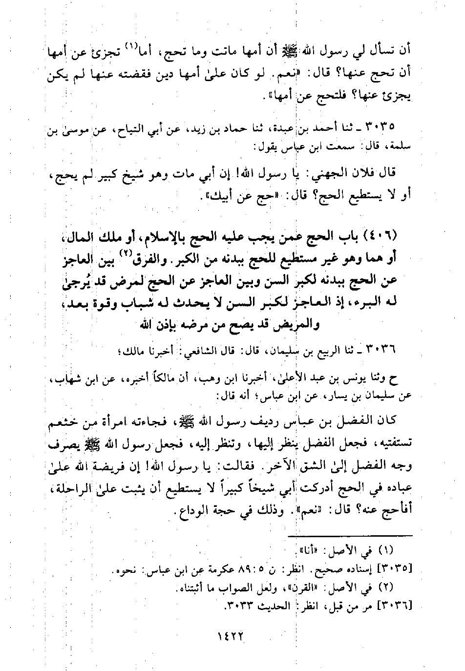 كَانَ الْفَضْلُ بْنُ عَبَّاسٍ رَدِيفَ رَسُولِ اللَّهِ - صَلَّى اللَّهُ عَلَيْهِ وَسَلَّمَ -، فَجَاءَتْهُ امْرَأَةٌ مِنْ خَثْعَمٍ تَسْتَفْتِيهِ، فَجَعَلَ الْفَضْلُ يَنْظُرُ إِلَيْهَا، وَتَنْظُرُ إِلَيْهِ، فَجَعَلَ رَسُولُ اللَّهِ - صَلَّى اللَّهُ عَلَيْهِ وَسَلَّمَ - يَصْرِفُ وَجْهَ الْفَضْلِ إِلَى الشِّقِّ الْآخَرِ. فَقَالَتْ: يَا رَسُولَ اللَّهِ! إِنَّ فَرِيضَةَ اللَّهِ عَلَى عِبَادِهِ فِي الْحَجِّ أَدْرَكَتْ أَبِي شَيْخًا كَبِيرًا لَا يَسْتَطِيعُ أَنْ يَثْبُتَ عَلَى الرَّاحِلَةِ، أَفَأَحُجُّ عَنْهُ؟ قَالَ: "نَعَمْ". وَذَلِكَ فِي حَجَّةِ الْوَدَاعِ.