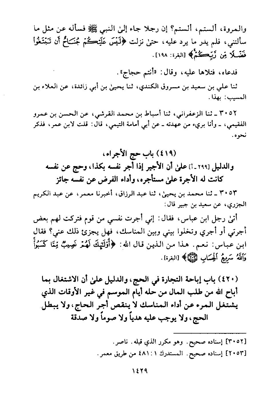 (420) بَابُ إِبَاحَةِ التِّجَارَةِ فِي الْحَجِّ، وَالدَّلِيلُ عَلَى أَنَّ الِاشْتِغَالَ بِمَا أَبَاحَ اللَّهُ مِنْ طَلَبِ الْمَالِ مِنْ حِلِّهِ أَيَّامَ الْمَوْسِمِ فِي غَيْرِ الْأَوْقَاتِ الَّذِي يَشْتَغِلُ الْمَرْءُ عَنْ أَدَاءِ الْمَنَاسِكِ لَا يَنْقُصُ أَجْرَ الْحَاجِّ، وَلَا يُبْطِلُ الْحَجَّ، وَلَا يُوجِبُ عَلَيْهِ هَدْيًا وَلَا صَوْمًا وَلَا صَدَقَةً