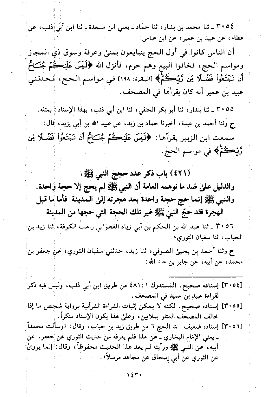 [3055] إسناده صحيح. لكنه لا يمكن إثبات القراءة القرآنية برواية شخص ما إذا خالف المصحف المتلو بملايين، وعلى هذا يكون الإسناد منكرًا.