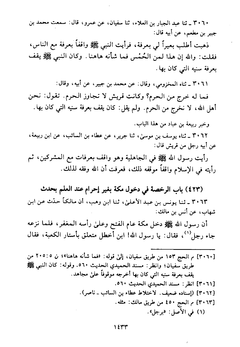 ذَهَبْتُ أَطْلُبُ بَعِيرًا لِي بِعَرَفَةَ، فَرَأَيْتُ النَّبِيَّ - صَلَّى اللَّهُ عَلَيْهِ وَسَلَّمَ - وَاقِفًا بِعَرَفَةَ مَعَ النَّاسِ، فَقُلْتُ: وَاللَّهِ إِنَّ هَذَا لِمَنَ الْحُمْسِ فَمَا شَأْنُهُ هَاهُنَا. وَكَانَ النَّبِيُّ - صَلَّى اللَّهُ عَلَيْهِ وَسَلَّمَ - يَقِفُ بِعَرَفَةَ سِنِيهِ الَّتِي كَانَ بِهَا.