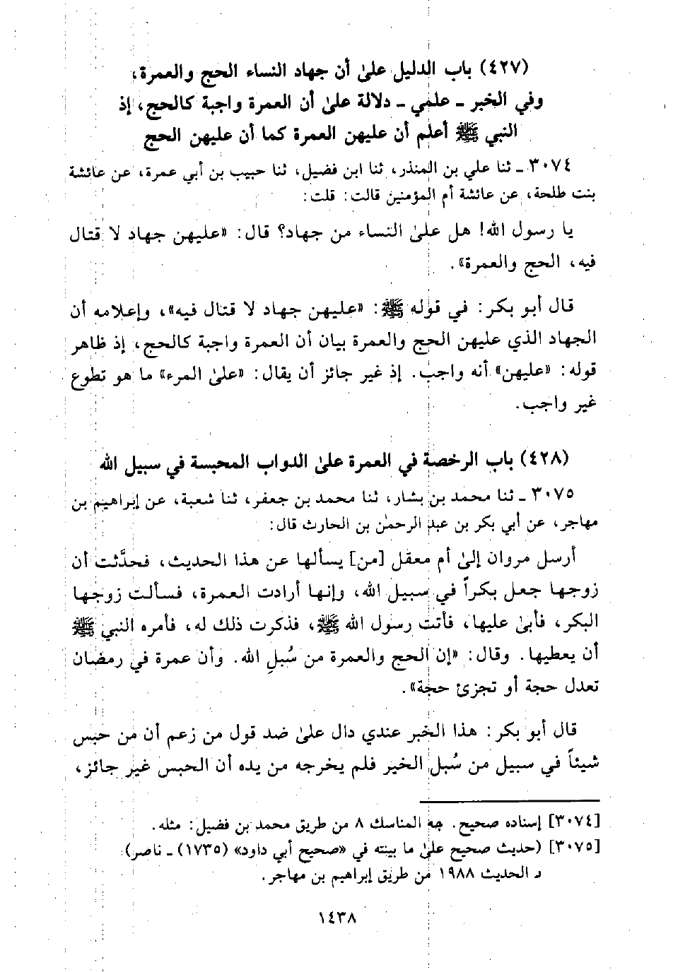 (427) بَابُ الدَّلِيلِ عَلَى أَنَّ جِهَادَ النِّسَاءِ الْحَجُّ وَالْعُمْرَةُ، وَفِي الْخَبَرِ -عِلْمِي- دَلَالَةٌ عَلَى أَنَّ الْعُمْرَةَ وَاجِبَةٌ كَالْحَجِّ، إِذِ النَّبِيُّ - صَلَّى اللَّهُ عَلَيْهِ وَسَلَّمَ - أَعْلَمَ أَنَّ عَلَيْهِنَّ الْعُمْرَةَ كَمَا أَنَّ عَلَيْهِنَّ الْحَجَّ
