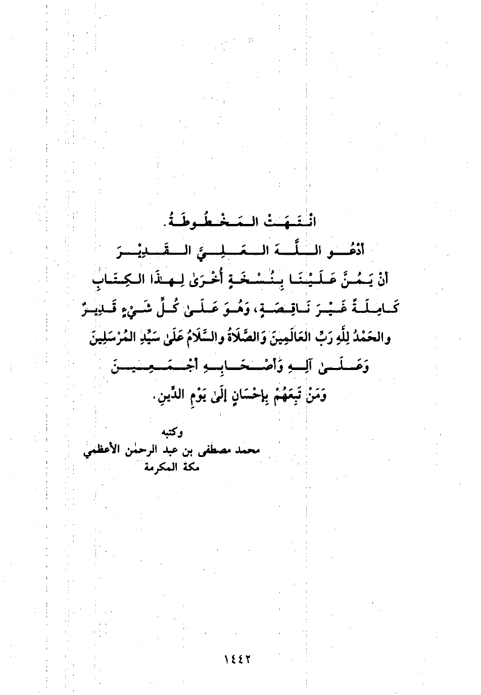 أدْعُو اللهَ العَلِيَّ القَدِيْرَ أنْ يَمُنَّ عَلَيْنَا بِنُسْخَةٍ أُخْرَى لِهذَا الكِتَابِ كَامِلَةً غَيْرَ نَاقِصَةٍ، وَهُوَ عَلَى كُلِّ شَيءٍ قَدِيرٌ والحَمْدُ لِلَّهِ رَبِّ العَالَمِينَ وَالصَّلَاةُ والسَّلَامُ عَلَى سَيِّدِ المُرْسَلِينَ وَعَلَى آلِهِ وَأصْحَابِهِ أجمَعِينَ وَمَنْ تَبِعَهُمْ بِإحْسَانٍ إلَى يَوْمِ الدِّينِ.