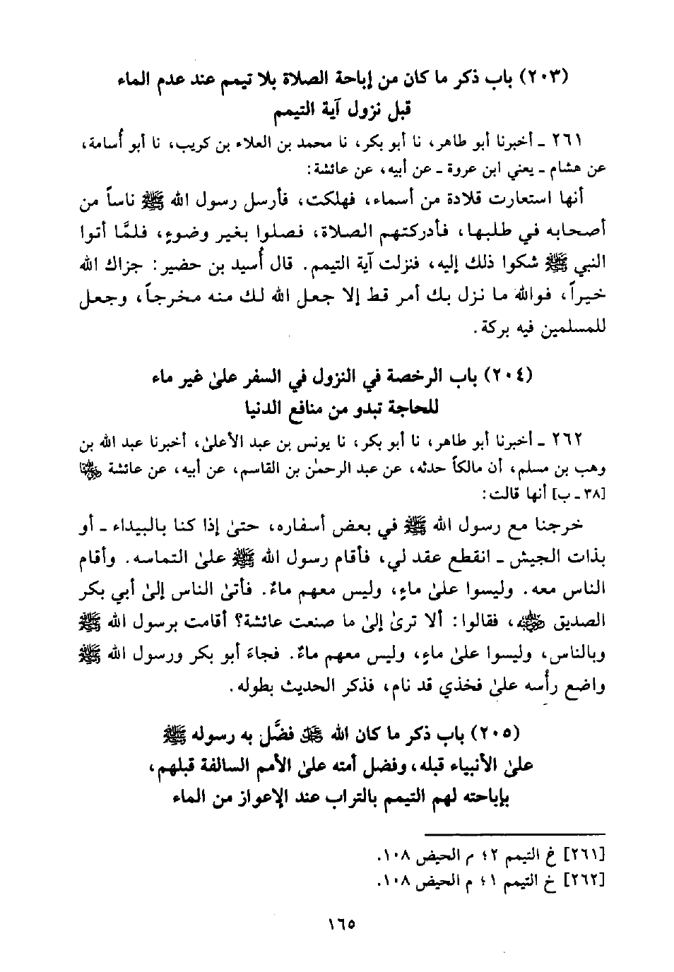 خَرَجْنَا مَعَ رَسُولِ اللَّهِ صَلَّى اللَّهُ عَلَيْهِ وَسَلَّمَ فِي بَعْضِ أَسْفَارِهِ، حَتَّى إِذَا كُنَّا بِالْبَيْدَاءِ -أَوْ بِذَاتِ الْجَيْشِ- انْقَطَعَ عِقْدٌ لِي، فَأَقَامَ رَسُولُ اللَّهِ - صَلَّى اللَّهُ عَلَيْهِ وَسَلَّمَ - عَلَى الْتِمَاسِهِ. وَأَقَامَ النَّاسُ مَعَهُ. وَلَيْسُوا عَلَى مَاءٍ، وَلَيْسَ مَعَهُمْ مَاءٌ. فَأَتَى النَّاسُ إِلَى أَبِي بَكْرٍ الصِّدِّيقِ -رَضِيَ اللَّهُ عَنْه-، فَقَالُوا: أَلَا تَرَى إِلَى مَا صَنَعَتْ عَائِشَةُ؟ أَقَامَتْ بِرَسُولِ اللَّهِ - صَلَّى اللَّهُ عَلَيْهِ وَسَلَّمَ - وَبِالنَّاسِ، وَلَيْسُوا عَلَى مَاءٍ، وَلَيْسَ مَعَهُمْ مَاءٌ. فَجَاءَ أَبُو بَكْرٍ وَرَسُولُ اللَّهِ - صَلَّى اللَّهُ عَلَيْهِ وَسَلَّمَ - وَاضِعٌ رَأْسَهُ عَلَى فَخِذِي قَدْ نَامَ، فَذَكَرَ الْحَدِيثَ بِطُولِهِ.