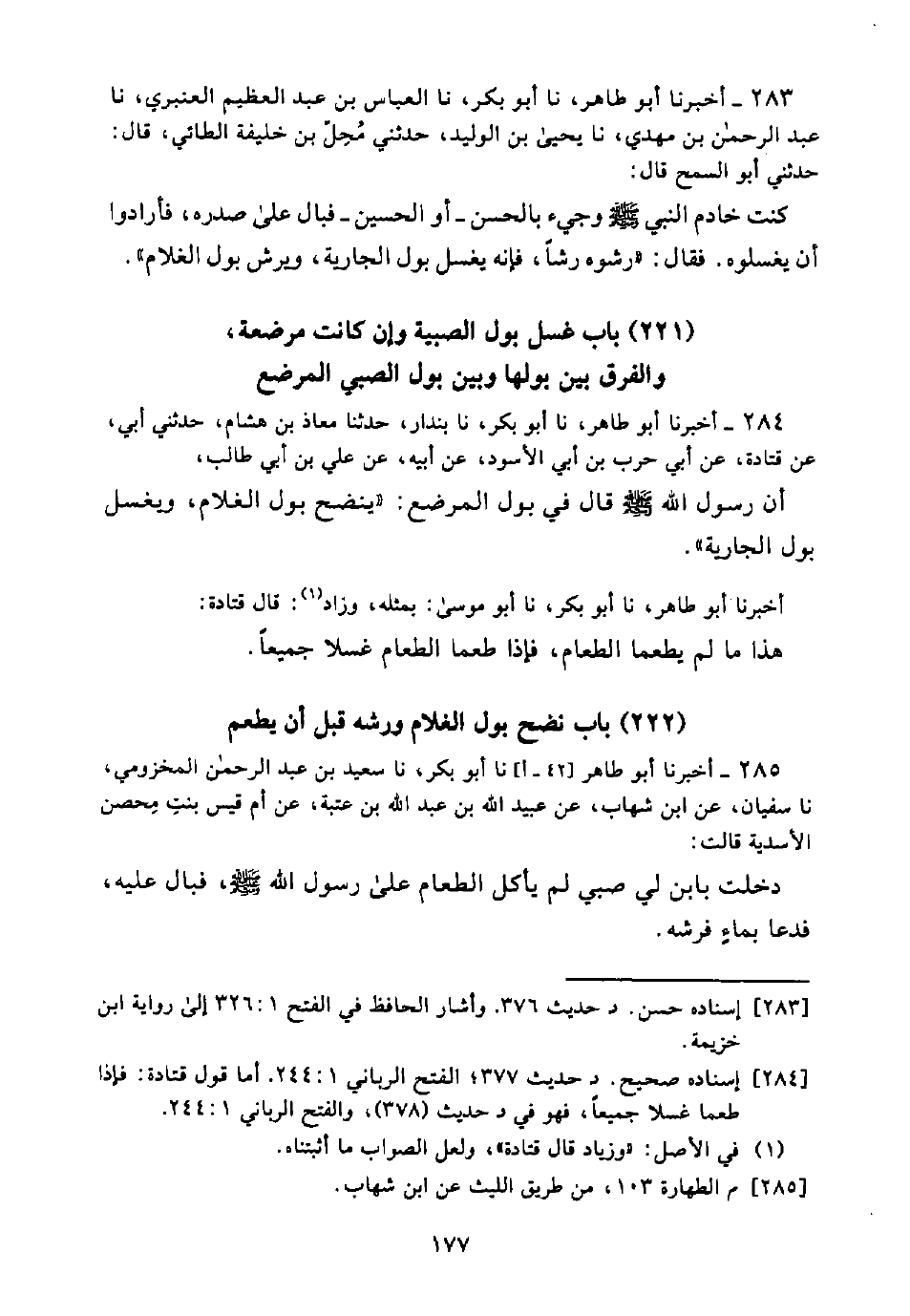 284 - أَخْبَرَنَا أَبُو طَاهِرٍ، نَا أَبُو بَكْرٍ، نَا بُنْدَارٌ، حَدَّثَنَا مُعَاذُ بْنُ هِشَامٍ، حَدَّثَنِي أَبِي، عَنْ قَتَادَةَ، عَنْ أَبِي حَرْبِ بْنِ أَبِي الْأَسْوَدِ، عَنْ أَبِيهِ، عَنْ عَلِيِّ بْنِ أَبِي طَالِبٍ، أَنَّ رَسُولَ اللَّهِ - صَلَّى اللَّهُ عَلَيْهِ وَسَلَّمَ - قَالَ فِي بَوْلِ الْمُرْضَعِ: "يُنْضَحُ بَوْلُ الْغُلَامِ، وَيُغْسَلُ بَوْلُ الْجَارِيَةِ".