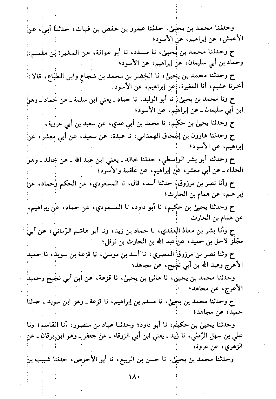 ح وَنَا مُحَمَّدُ بْنُ يَحْيَى، نَا أَبُو الْوَلِيدِ، نَا حَمَّادٌ -يَعْنِي ابْنَ سَلَمَةَ-، عَنْ حَمَّادٍ -وَهُوَ ابْنُ أَبِي سُلَيْمَانَ-، عَنْ إِبْرَاهِيمَ، عَنِ الْأَسْوَدِ؛ ح وَحَدَّثَنَا يَحْيَى بْنُ حَكِيمٍ، نَا مُحَمَّدُ بْنُ أَبِي عَدِيٍّ، عَنْ سَعِيدِ بْنِ أَبِي عَرُوبَةَ، ح وَحَدَّثَنَا هَارُونُ بْنُ إِسْحَاقَ الْهَمْدَانِيُّ، نَا عَبْدَةُ، عَنْ سَعِيدٍ، عَنْ أَبِي مَعْشَرٍ، عَنْ إِبْرَاهِيمَ، عَنِ الْأَسْوَدِ؛ ح وَحَدَّثَنَا أَبُو بِشْرٍ الْوَاسِطِيُّ، حَدَّثَنَا خَالِدٌ -يَعْنِي ابْنَ عَبْدِ اللَّهِ-، عَنْ خَالِدٍ -وَهُوَ الْحَذَّاءُ-، عَنْ أَبِي مَعْشَرٍ، عَنْ إِبْرَاهِيمَ، عَنْ عَلْقَمَةَ وَالْأَسْوَدِ؛ ح وَأَنَا نَصْرُ بْنُ مَرْزُوقٍ، حَدَّثَنَا أَسَدٌ، قَالَ: نَا الْمَسْعُودِيُّ، عَنِ الْحَكَمِ وَحَمَّادٍ، عَنْ إِبْرَاهِيمَ، عَنْ هَمَّامِ بْنِ الْحَارِثِ؛ ح وَحَدَّثَنَا يَحْيَى بْنُ حَكِيمٍ، نَا أَبُو دَاوُدَ، نَا الْمَسْعُودِيُّ، عَنْ حَمَّادٍ، عَنْ إِبْرَاهِيمَ، عَنْ هَمَّامِ بْنِ الْحَارِثِ ح وَأَنَا بِشْرُ بْنُ مُعَاذٍ الْعَقَدِيُّ، نَا حَمَّادُ بْنُ زَيْدٍ، وَنَا أَبُو هَاشِمٍ الرُّمَّانِيُّ، عَنْ أَبِي مِجْلَزٍ لَاحِقِ بْنِ حُمَيْدٍ، عَنْ عَبْدِ اللَّهِ بْنِ الْحَارِثِ بْنِ نَوْفَلٍ؛ ح وثَنَا نَصْرُ بْنُ مَرْزُوقٍ الْمِصْرِيُّ، نَا أَسَدُ بْنُ مُوسَى، نَا قَزَعَةُ بْنُ سُوَيْدٍ، نَا حُمَيْدٌ الْأَعْرَجُ، وَعَبْدُ اللَّهِ بْنُ أَبِي نَجِيحٍ، عَنْ مُجَاهِدٍ؛ وَحَدَّثَنَا مُحَمَّدُ بْنُ يَحْيَى، نَا هَانِئُ بْنُ يَحْيَى، نَا قَزَعَةُ، عَنِ ابْنِ أَبِي نَجِيحٍ وَحُمَيْدٍ الْأَعْرَجِ، عَنْ مُجَاهِدٍ؛ ح وَحَدَّثَنَا مُحَمَّدُ بْنُ يَحْيَى، نَا مُسْلِمُ بْنُ إِبْرَاهِيمَ، نَا قَزَعَةُ -وَهُوَ ابْنُ سُوَيْدٍ- حَدَّثَنَا حُمَيْدٌ، عَنْ مُجَاهِدٍ؛ وَحَدَّثَنَا يَحْيَى بْنُ حَكِيمٍ، نَا أَبُو دَاوُدَ؛ وَحَدَّثَنَا عَبَّادُ بْنُ مَنْصُورٍ، أَنَا الْقَاسِمُ؛ وَنَا عَلِيُّ بْنُ سَهْلٍ الرَّمْلِيُّ، نَا زَيْدٌ -يَعْنِي ابْنَ أَبِي الزَّرْقَاءِ-، عَنْ جَعْفَرٍ -وَهُوَ ابْنُ بُرْقَانَ-، عَنِ الزُّهْرِيِّ، عَنْ عُرْوَةَ؛ وَحَدَّثَنَا مُحَمَّدُ بْنُ يَحْيَى، نَا حَسَنُ بْنُ الرَّبِيعِ، نَا أَبُو الْأَحْوَصِ، حَدَّثَنَا شَبِيبُ بْنُ