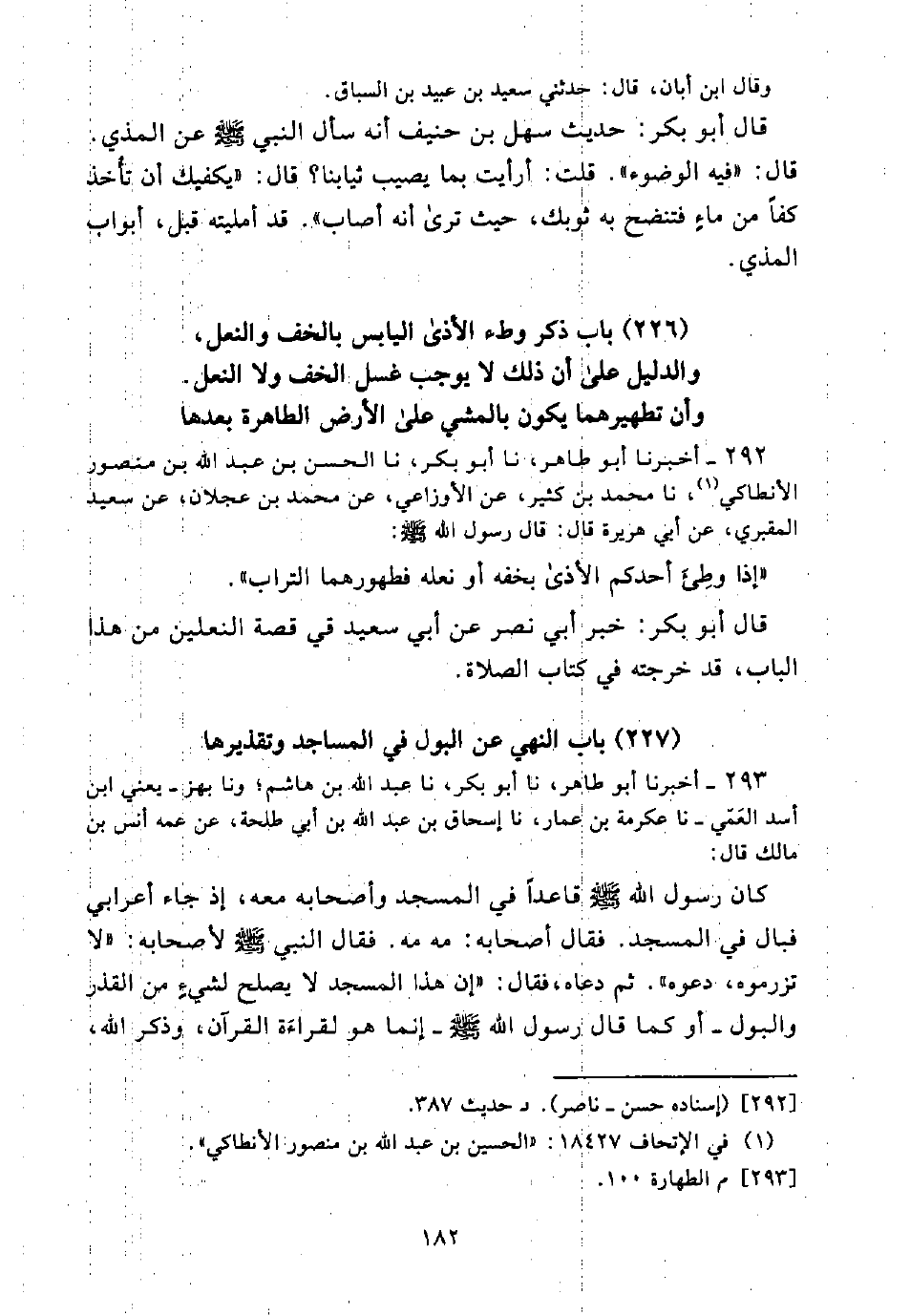 قَالَ أَبُو بَكْرٍ: "حَدِيثُ سَهْلِ بْنِ حُنَيْفٍ أَنَّهُ سَأَلَ النَّبِيَّ - صَلَّى اللَّهُ عَلَيْهِ وَسَلَّمَ -، عَنِ الْمَذْيِ. قَالَ: "فِيهِ الْوُضُوءُ". قُلْتُ: أَرَأَيْتَ بِمَا يُصِيبُ ثِيَابَنَا؟ قَالَ: "يَكْفِيكَ أَنْ تَأْخُذَ كَفًّا مِنْ مَاءٍ فَتَنْضَحَ بِهِ ثَوْبَكَ، حَيْثُ تَرَى أَنَّهُ أَصَابَ". قَدْ أَمْلَيْتُهُ قَبْلَ، أَبْوَابِ الْمَذْيِ.
