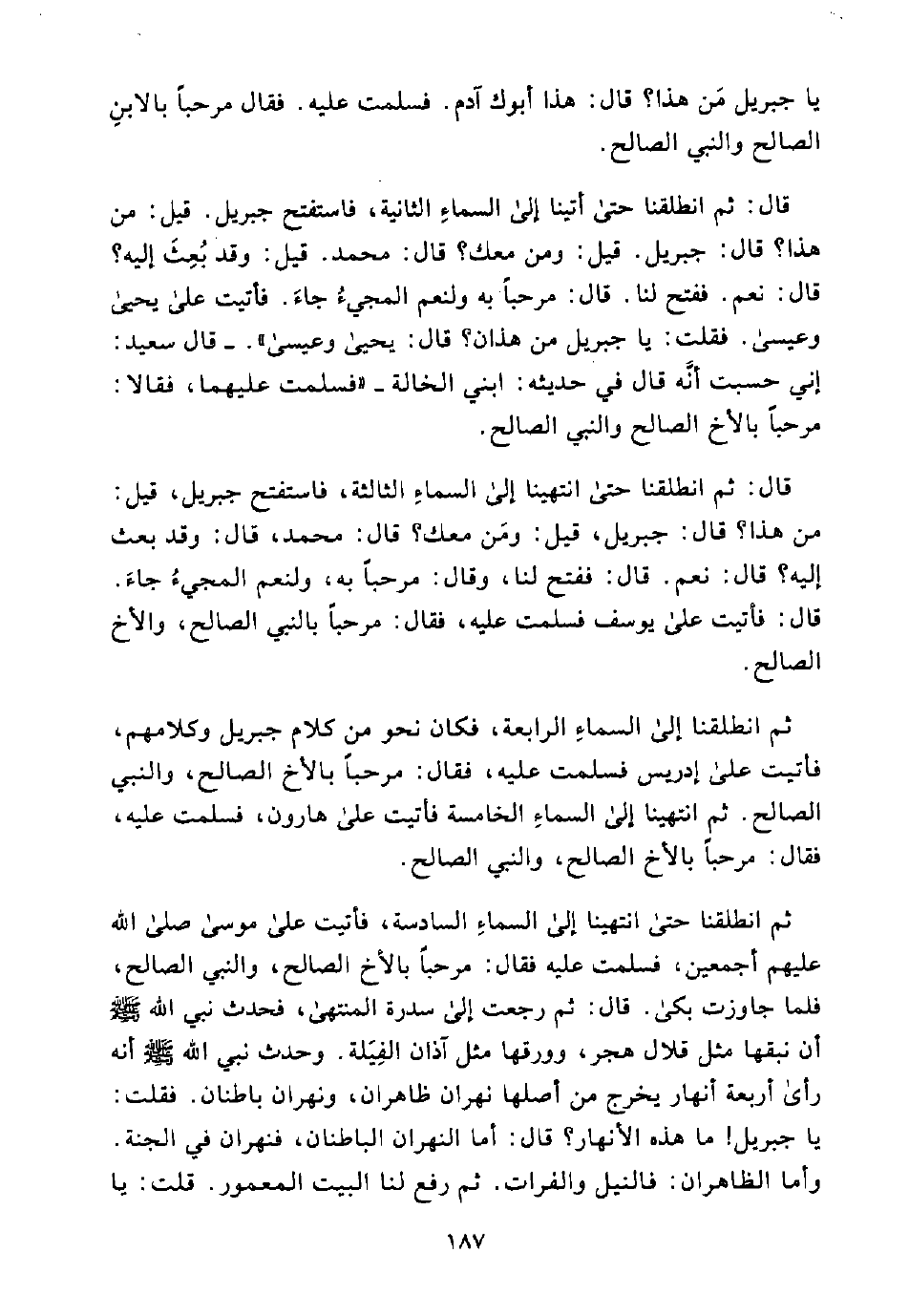 ثُمَّ انْطَلَقْنَا حَتَّى انْتَهَيْنَا إِلَى السَّمَاءِ السَّادِسَةِ، فَأَتَيْتُ عَلَى مُوسَى - صَلَّى اللَّهُ عَلَيْهِمْ أَجْمَعِينَ، فَسَلَّمْتُ عَلَيْهِ فَقَالَ: مَرْحَبًا بِالْأَخِ الصَّالِحِ، وَالنَّبِيِّ الصَّالِحِ، فَلَمَّا جَاوَزْتُ بَكَى. قَالَ: ثُمَّ رَجَعْتُ إِلَى سِدْرَةِ الْمُنْتَهَى، فَحَدَّثَ نَبِيُّ اللَّهِ - صَلَّى اللَّهُ عَلَيْهِ وَسَلَّمَ - أَنَّ نَبْقَهَا مِثْلُ قِلَالِ هَجَرَ، وَوَرَقَهَا مِثْلُ آذَانِ الْفِيَلَةِ، وَحَدَّثَ نَبِيُّ اللَّهِ - صَلَّى اللَّهُ عَلَيْهِ وَسَلَّمَ - أَنَّهُ رَأَى أَرْبَعَةَ أَنْهَارٍ يَخْرُجُ مِنْ أَصْلِهَا نَهَرَانِ ظَاهِرَانِ، وَنَهْرَانِ بَاطِنَانِ. فَقُلْتُ: يَا جِبْرِيلُ! مَا هَذِهِ الْأَنْهَارُ؟ قَالَ: أَمَّا النَّهَرَانِ الْبَاطِنَانِ، فَنَهَرَانِ فِي الْجَنَّةِ. وَأَمَّا الظَّاهِرَانِ: فَالنِّيلُ وَالْفُرَاتُ. ثُمَّ رُفِعَ لَنَا الْبَيْتُ الْمَعْمُورُ. قُلْتُ: يَا