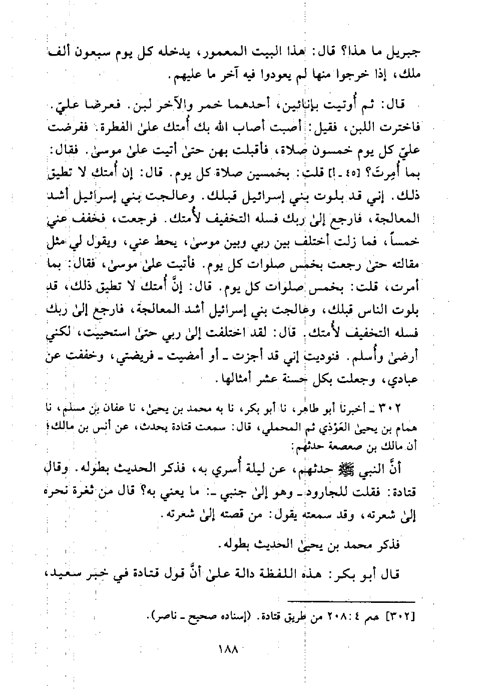 302 - أَخْبَرَنَا أَبُو طَاهِرٍ، نَا أَبُو بَكْرٍ، نَا بِهِ مُحَمَّدُ بْنُ يَحْيَى، نَا عَفَّانُ بْنُ مُسْلِمٍ، نَا هَمَّامُ بْنُ يَحْيَى الْعَوْذِيُّ، ثُمَّ الْمَحْمَلِيُّ، قَالَ: سَمِعْتُ قَتَادَةَ يُحَدِّثُ، عَنْ أَنَسِ بْنِ مَالِكٍ؛ أَنَّ مَالِكَ بْنَ صَعْصَعَةَ حَدَّثَهُمْ: