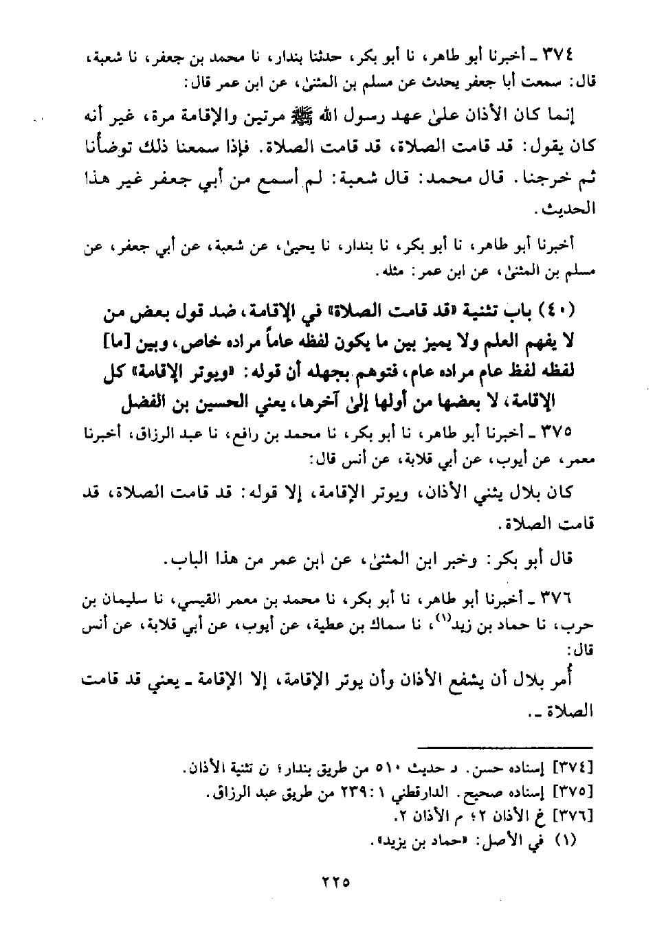 (40) بَابُ تَثْنِيَةِ "قَدْ قَامَتِ الصَّلَاةُ" فِي الْإِقَامَةِ، ضِدَّ قَوْلِ بَعْضِ مَنْ لَا يَفْهَمُ الْعِلْمَ وَلَا يُمَيِّزُ بَيْنَ مَا يَكُونُ لَفْظُهُ عَامًّا مُرَادُهُ خَاصٌّ، وَبَيْنَ [مَا] لَفْظُهُ لَفْظٌ عَامٌّ مُرَادُهُ عَامٌّ، فَتَوَهَّمَ بِجَهْلِهِ أَنَّ قَوْلَهُ: "وَيُوتِرُ الْإِقَامَةَ" كُلَّ الْإِقَامَةِ، لَا بَعْضَهَا مِنْ أَوَّلِهَا إِلَى آخِرِهَا، يَعْنِي الْحُسَيْنَ بْنَ الْفَضْلِ