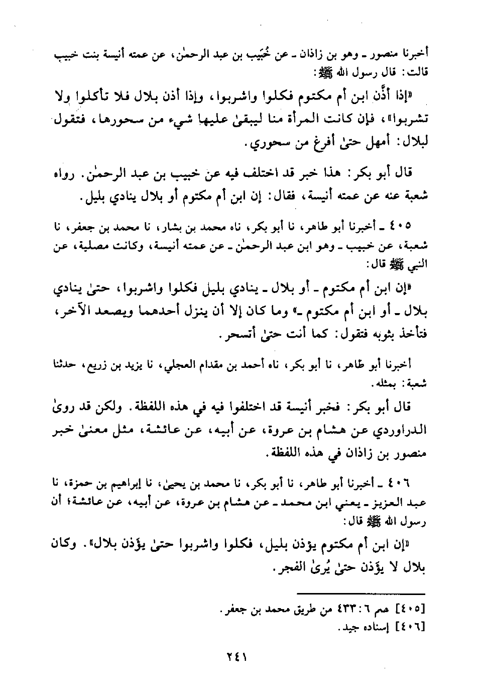 "إِنَّ ابْنَ أُمِّ مَكْتُومٍ يُؤَذِّنُ بِلَيْلٍ، فَكُلُوا وَاشْرَبُوا حَتَّى يُؤَذِّنَ بِلَالٌ". وَكَانَ بِلَالٌ لَا يُؤَذِّنُ حَتَّى يُرَى الْفَجْرُ.