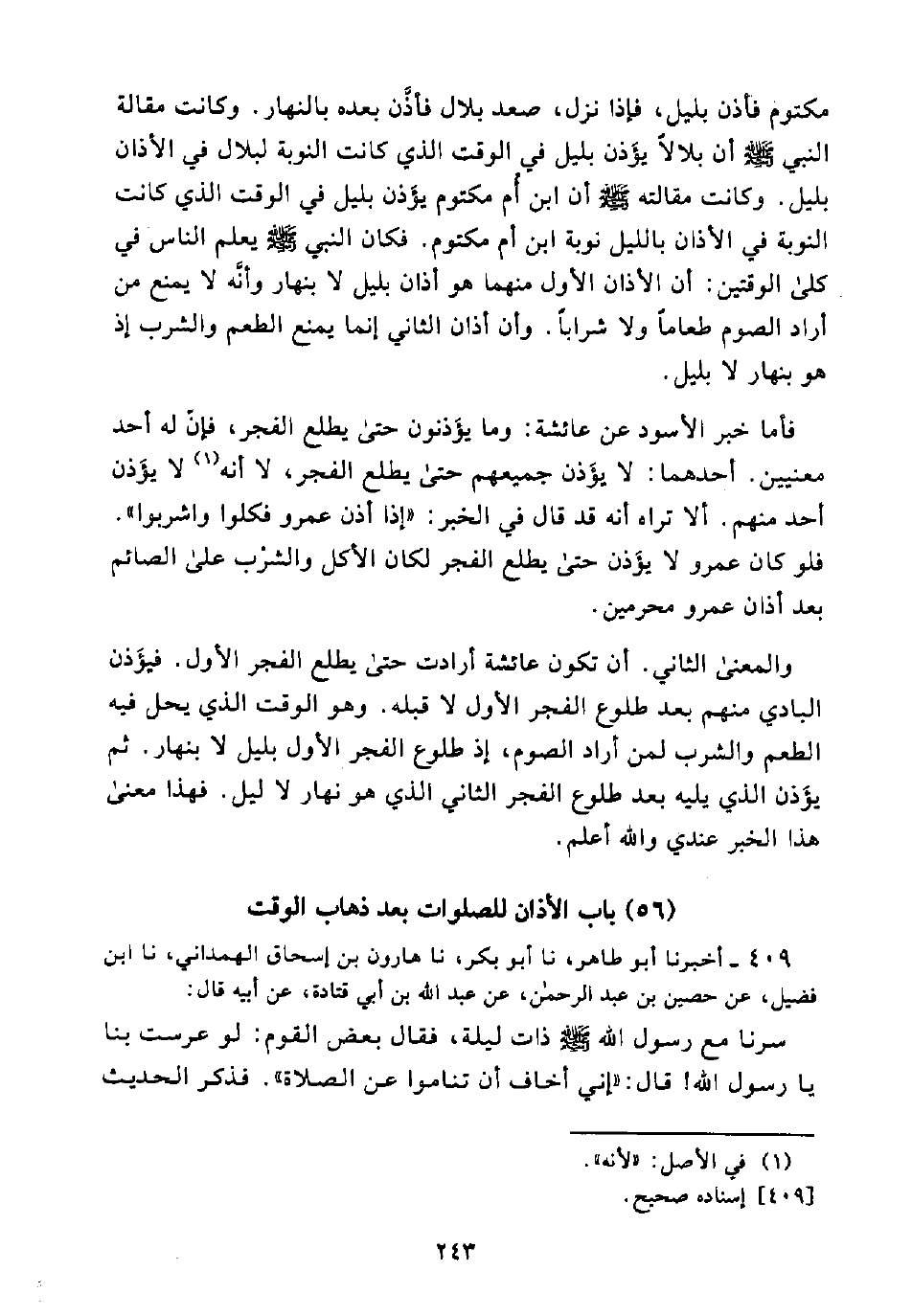 مَكْتُومٍ فَأَذَّنَ بِلَيْلٍ، فَإِذَا نَزَلَ صَعِدَ بِلَالٌ فَأَذَّنَ بَعْدَهُ بِالنَّهَارِ. وَكَانَتْ مَقَالَةُ النَّبِيِّ - صَلَّى اللَّهُ عَلَيْهِ وَسَلَّمَ - أَنَّ بِلَالًا يُؤَذِّنُ بِلَيْلٍ فِي الْوَقْتِ الَّذِي كَانَتِ النَّوْبَةُ لِبِلَالٍ فِي الْأَذَانِ بِلَيْلٍ. وَكَانَتْ مَقَالَتُهُ - صَلَّى اللَّهُ عَلَيْهِ وَسَلَّمَ - أَنَّ ابْنَ أُمِّ مَكْتُومٍ يُؤَذِّنُ بِلَيْلٍ فِي الْوَقْتِ الَّذِي كَانَتِ النَّوْبَةُ فِي الْأَذَانِ بِاللَّيْلِ نَوْبَةَ ابْنِ أُمِّ مَكْتُومٍ. فَكَانَ النَّبِيُّ - صَلَّى اللَّهُ عَلَيْهِ وَسَلَّمَ - يُعْلِمُ النَّاسَ فِي كِلَى الْوَقْتَيْنِ: أَنَّ الْأَذَانَ الْأَوَّلَ مِنْهُمَا هُوَ أَذَانٌ بِلَيْلٍ لَا بِنَهَارٍ وَأَنَّهُ لَا يَمْنَعُ مَنْ أَرَادَ الصَّوْمَ طَعَامًا وَلَا شَرَابًا. وَأَنَّ أَذَانَ الثَّانِي إِنَّمَا يَمْنَعُ الطّعم وَالشّربَ إِذْ هُوَ بِنَهَارٍ لَا بِلَيْلٍ.