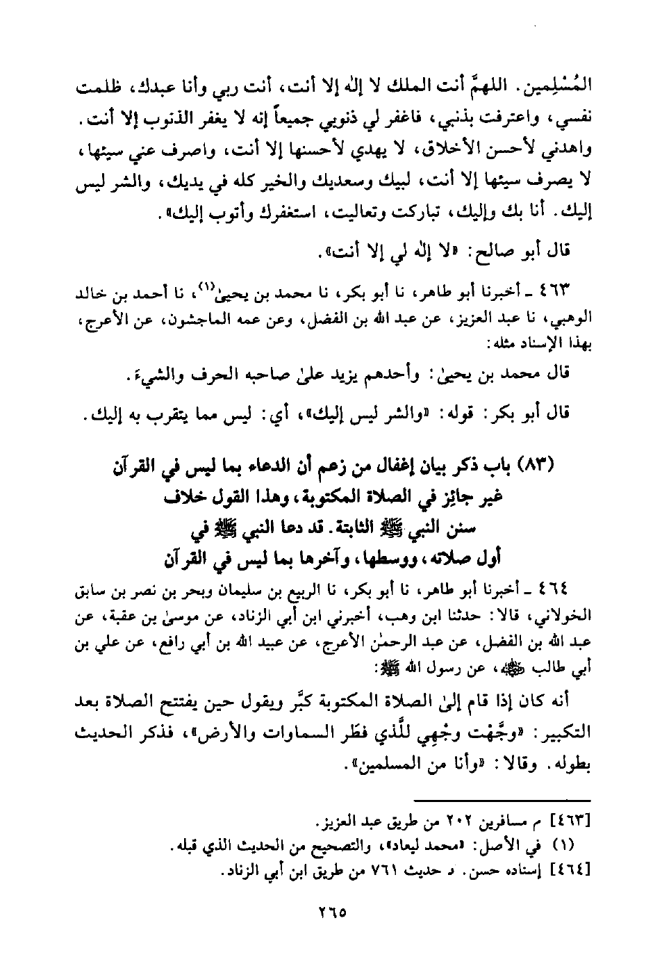 (83) بَابُ ذِكْرِ بَيَانِ إِغْفَالِ مَنْ زَعَمَ أَنَّ الدُّعَاءَ بِمَا لَيْسَ فِي الْقُرْآنِ غَيْرُ جَائِزٍ فِي الصَّلَاةِ الْمَكْتُوبَةِ، وَهَذَا الْقَوْلُ خِلَافُ سُنَنِ النَّبِيِّ - صَلَّى اللَّهُ عَلَيْهِ وَسَلَّمَ - الثَّابِتَةِ. قَدْ دَعَا النَّبِيُّ - صَلَّى اللَّهُ عَلَيْهِ وَسَلَّمَ - فِي أَوَّلِ صَلَاتِهِ، وَوَسَطِهَا، وَآخِرِهَا بِمَا لَيْسَ فِي الْقُرْآنِ