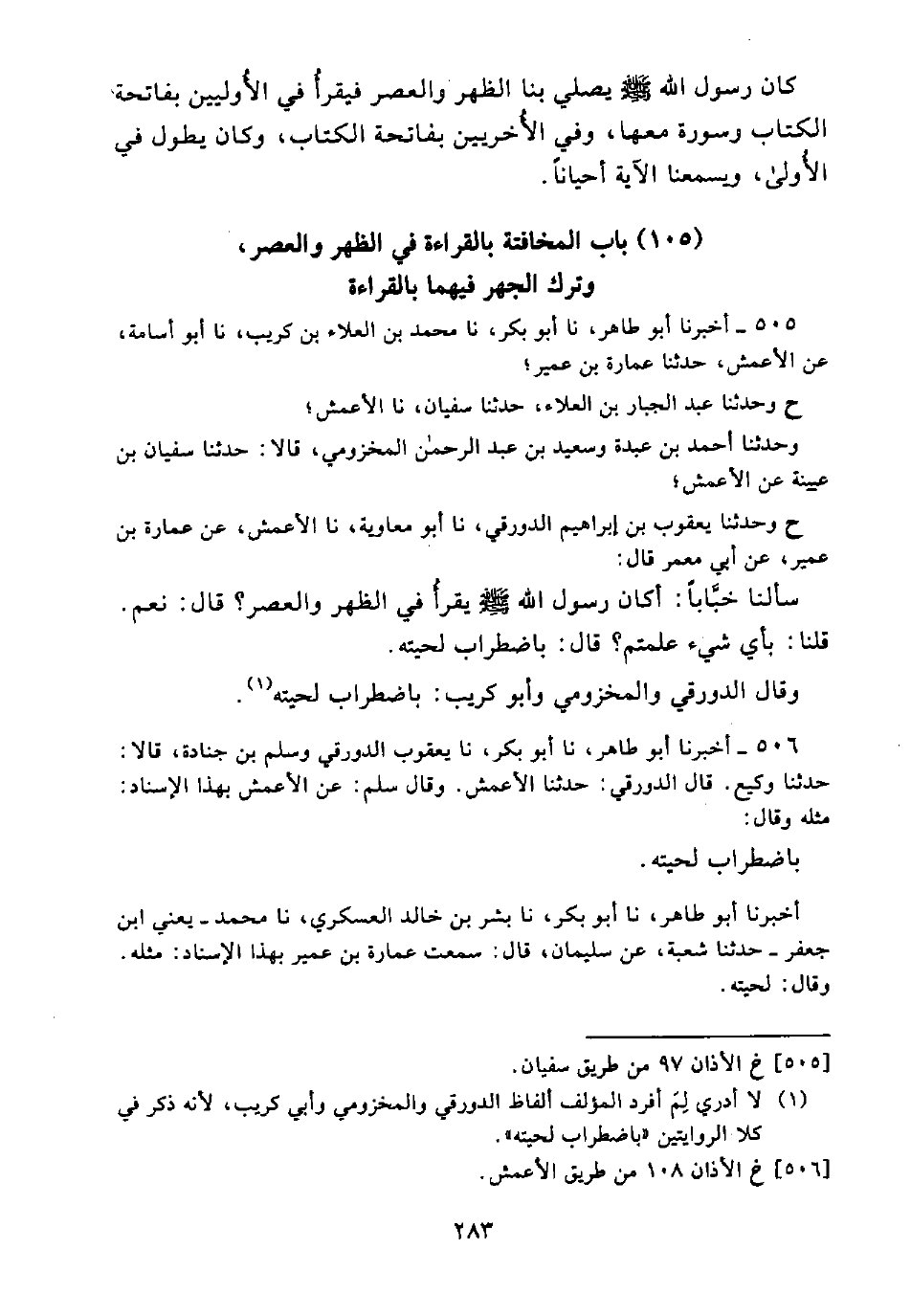 (105) بَابُ الْمُخَافَتَةِ بِالْقِرَاءَةِ فِي الظُّهْرِ وَالْعَصْرِ، وَتَرْكِ الْجَهْرِ فِيهِمَا بِالْقِرَاءَةِ