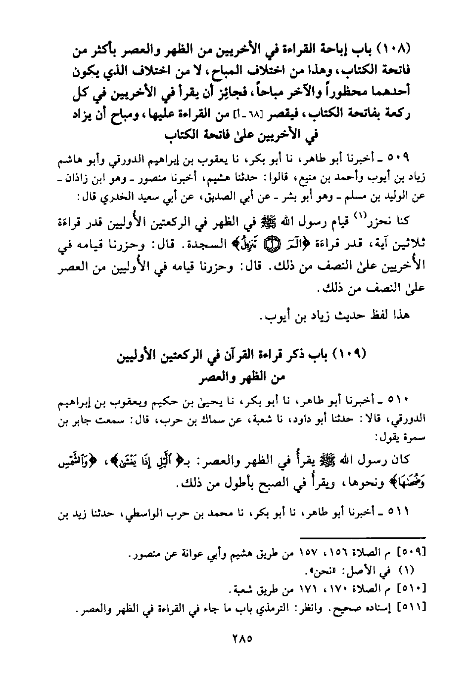 (108) بَابُ إِبَاحَةِ الْقِرَاءَةِ فِي الْأُخْرَيَيْنِ مِنَ الظُّهْرِ وَالْعَصْرِ بِأَكْثَرَ مِنْ فَاتِحَةِ الْكِتَابِ، وَهَذَا مِنِ اخْتِلَافِ الْمُبَاحِ، لَا مِنِ اخْتِلَافِ الَّذِي يَكُونُ أَحَدُهُمَا مَحْظُورًا وَالْآخَرُ مُبَاحًا، فَجَائِزٌ أَنْ يَقْرَأَ فِي الْأُخْرَيَيْنِ فِي كُلِّ رَكْعَةٍ بِفَاتِحَةِ الْكِتَابِ، فَيَقْصُرَ [68 - أ] مِنَ الْقِرَاءَةِ عَلَيْهَا، وَمُبَاحٌ أَنْ يُزَادَ فِي الْأُخْرَيَيْنِ عَلَى فَاتِحَةِ الْكِتَابِ