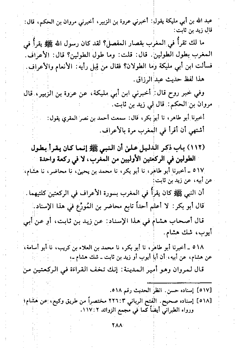 518 - أَخْبَرَنَا أَبُو طَاهِرٍ، نَا أَبُو بَكْرٍ، نَا مُحَمَّدُ بْنُ الْعَلَاءِ بْنِ كُرَيْبٍ، نَا أَبُو أُسَامَةَ، عَنْ هِشَامٍ، عَنْ أَبِيهِ، أَنَّ أَبَا أَيُّوبَ، أَوْ زَيْدَ بْنَ ثَابِتٍ -شَكَّ هِشَامٌ-، قَالَ لِمَرْوَانَ وَهُوَ أَمِيرُ الْمَدِينَةِ: إِنَّكَ تُخِفُّ الْقِرَاءَةَ فِي الرَّكْعَتَيْنِ مِنَ