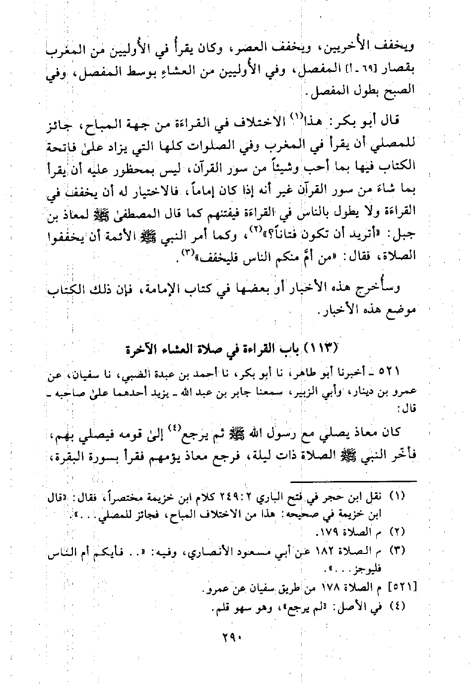 قَالَ أَبُو بَكْرٍ: هَذَا (¬1) الِاخْتِلَافُ فِي الْقِرَاءَةِ مِنْ جِهَةِ الْمُبَاحِ، جَائِزٌ لِلْمُصَلِّي أَنْ يَقْرَأَ فِي الْمَغْرِبِ وَفِي الصَّلَوَاتِ كُلِّهَا الَّتِي يُزَادُ عَلَى فَاتِحَةِ الْكِتَابِ فِيهَا بِمَا أَحَبَّ وَشَيْئًا مِنْ سُوَرِ الْقُرْآنِ، لَيْسَ بِمَحْظُورٍ عَلَيْهِ أَنْ يَقْرَأَ بِمَا شَاءَ مِنْ سُوَرِ الْقُرْآنِ غَيْرَ أَنَّهُ إِذَا كَانَ إِمَامًا، فَالِاخْتِيَارُ لَهُ أَنْ يُخَفِّفَ فِي الْقِرَاءَةِ وَلَا يُطَوِّلَ بِالنَّاسِ فِي الْقِرَاءَةِ فَيَفْتِنَهُمْ كَمَا قَالَ الْمُصْطَفَى - صَلَّى اللَّهُ عَلَيْهِ وَسَلَّمَ - لِمُعَاذِ بْنِ جَبَلٍ: "أَتُرِيدُ أَنْ تَكُونَ فَتَّانًا"؟ (¬2)، وَكَمَا أَمَرَ النَّبِيُّ - صَلَّى اللَّهُ عَلَيْهِ وَسَلَّمَ - الْأَئِمَّةَ أَنْ يُخَفِّفُوا الصَّلَاةَ، فَقَالَ: "مَنْ أَمَّ مِنْكُمُ النَّاسَ فَلْيُخَفِّفْ" (¬3).