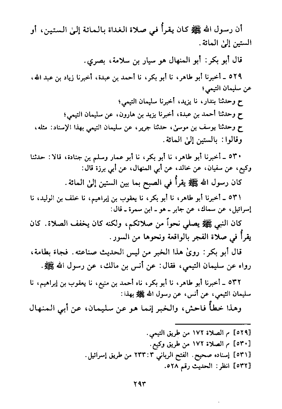 529 - أَخْبَرَنَا أَبُو طَاهِرٍ، نَا أَبُو بَكْرٍ، نَا أَحْمَدُ بْنُ عَبْدَةَ، أَخْبَرَنَا زِيَادُ بْنُ عَبْدِ اللَّهِ، عَنْ سُلَيْمَانَ التَّيْمِيِّ؛ ح وَحَدَّثَنَا بُنْدَارٌ، نَا يَزِيدُ، أَخْبَرَنَا سُلَيْمَانُ التَّيْمِيُّ؛ ح وَحَدَّثَنَا أَحْمَدُ بْنُ عَبْدَةَ، أَخْبَرَنَا يَزِيدُ بْنُ هَارُونَ، عَنْ سُلَيْمَانَ التَّيْمِيِّ؛ ح وَحَدَّثَنَا يُوسُفُ بْنُ مُوسَى، حَدَّثَنَا جَرِيرٌ، عَنْ سُلَيْمَانَ التَّيْمِيِّ بِهَذَا الْإِسْنَادِ: مِثْلَهُ، وَقَالُوا: بِالسِّتِّينَ إِلَى الْمِائَةِ.