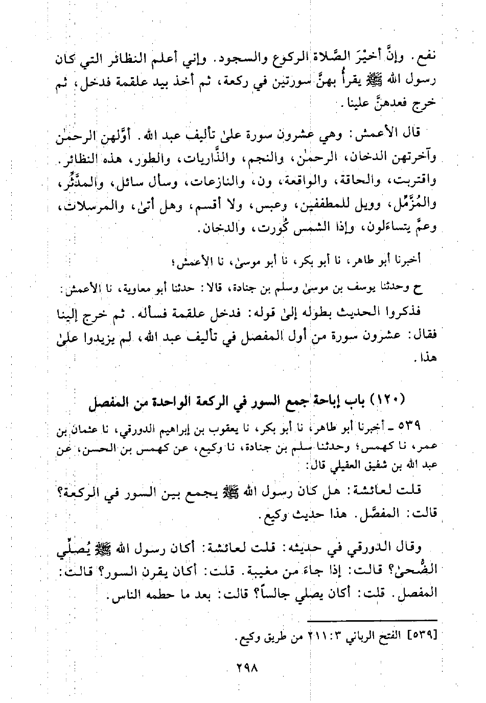 (120) بَابُ إِبَاحَةِ جَمْعِ السُّوَرِ فِي الرَّكْعَةِ الْوَاحِدَةِ مِنَ الْمُفَصَّلِ