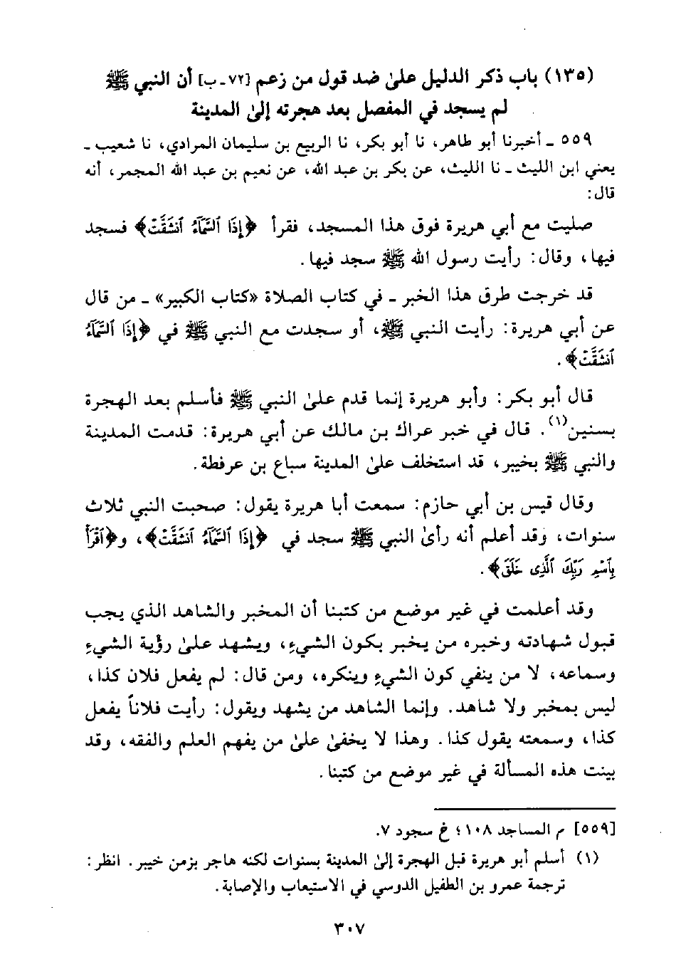 قَدْ خَرَّجْتُ طُرُقَ هَذَا الْخَبَرِ -فِي كِتَابِ الصَّلَاةِ "كِتَابِ الْكَبِيرُ"- مَنْ قَالَ عَنْ أَبِي هُرَيْرَةَ: رَأَيْتُ النَّبِيَّ - صَلَّى اللَّهُ عَلَيْهِ وَسَلَّمَ -، أَوْ سَجَدْتُ مَعَ النَّبِيِّ - صَلَّى اللَّهُ عَلَيْهِ وَسَلَّمَ - فِي: (إِذَا السَّمَاءُ انْشَقَّتْ).
