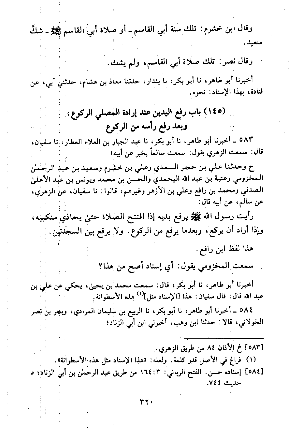 583 - أَخْبَرَنَا أَبُو طَاهِرٍ، نَا أَبُو بَكْرٍ، نَا عَبْدُ الْجَبَّارِ بْنُ الْعَلَاءِ الْعَطَّارُ، نَا سُفْيَانُ، قَالَ: سَمِعْتُ الزُّهْرِيَّ يَقُولُ: سَمِعْتُ سَالِمًا يُخْبِرُ عَنْ أَبِيهِ؛ ح وَحَدَّثَنَا عَلِيُّ بْنُ حُجْرٍ السَّعْدِيُّ وَعَلِيُّ بْنُ خَشْرَمٍ وَسَعِيدُ بْنُ عَبْدِ الرَّحْمَنِ الْمَخْزُومِيُّ وَعُتْبَةُ بْنُ عَبْدِ اللَّهِ الْيَحْمَدِيُّ وَالْحَسَنُ بْنُ مُحَمَّدٍ وَيُونُسُ بْنُ عَبْدِ الْأَعْلَى الصَّدَفِيُّ وَمُحَمَّدُ بْنُ رَافِعٍ وَعَلِيُّ بْنُ الْأَزْهَرِ وَغَيْرِهِمْ، قَالُوا: نَا سُفْيَانُ، عَنِ الزُّهْرِيِّ، عَنْ سَالِمٍ، عَنْ أَبِيهِ قَالَ: