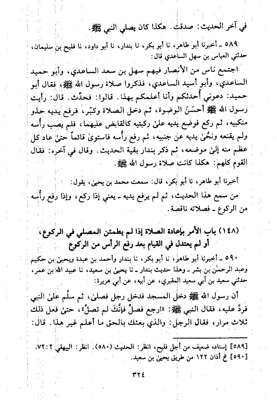 (148) بَابُ الْأَمْرِ بِإِعَادَةِ الصَّلَاةِ إِذَا لَمْ يَطْمَئِنَّ الْمُصَلِّي فِي الرُّكُوعِ، أَوْ لَمْ يَعْتَدِلْ فِي الْقِيَامِ بَعْدَ رَفْعِ الرَّأْسِ مِنَ الرُّكُوعِ