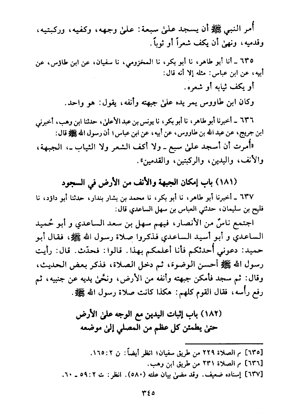 "أُمِرْتُ أَنْ أَسْجُدَ عَلَى سَبْعٍ -وَلَا أَكُفُّ الشَّعْرَ وَلَا الثِّيَابَ-، الْجَبْهَةِ، وَالْأَنْفِ، وَالْيَدَيْنِ، وَالرُّكْبَتَيْنِ، وَالْقَدَمَيْنِ".