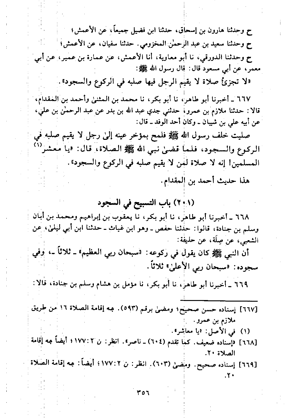 "لَا تُجْزِئُ صَلَاةٌ لَا يُقِيمُ الرَّجُلُ فِيهَا صُلْبَهُ فِي الرُّكُوعِ وَالسُّجُودِ".
