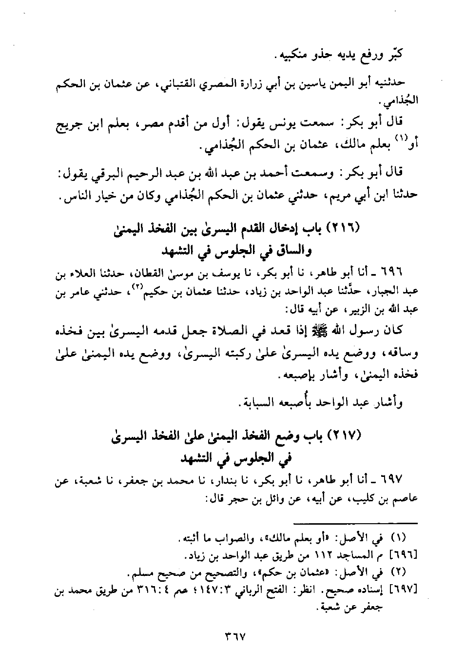 (217) بَابُ وَضْعِ الْفَخِذِ الْيُمْنَى عَلَى الْفَخِذِ الْيُسْرَى فِي الْجُلُوسِ فِي التَّشَهُّدِ
