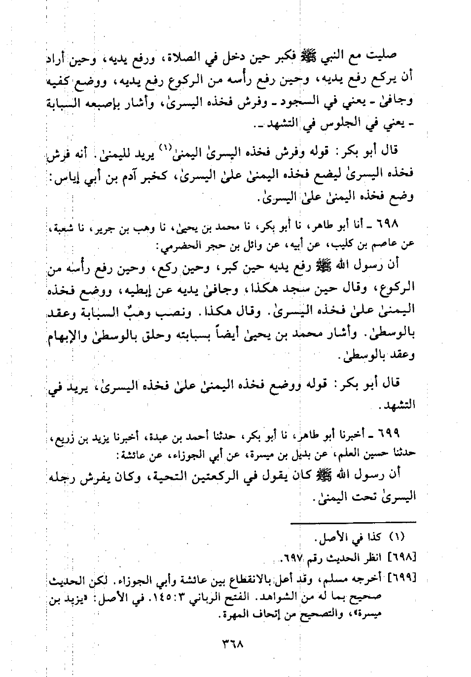 أَنَّ رَسُولَ اللَّهِ صَلَّى اللَّهُ عَلَيْهِ وَسَلَّمَ رَفَعَ يَدَيْهِ حِينَ كَبَّرَ، وَحِينَ رَكَعَ، وَحِينَ رَفَعَ رَأْسَهُ مِنَ الرُّكُوعِ، وَقَالَ حِينَ سَجَدَ هَكَذَا، وَجَافَى يَدَيْهِ عَنْ إِبْطَيْهِ، وَوَضَعَ فَخِذَهُ الْيُمْنَى عَلَى فَخِذِهِ الْيُسْرَى. وَقَالَ: هَكَذَا. وَنَصَبَ وَهْبٌ السَّبَّابَةَ وَعَقَدَ بِالْوُسْطَى. وَأَشَارَ مُحَمَّدُ بْنُ يَحْيَى أَيْضًا بِسَبَّابَتِهِ وَحَلَّقَ بِالْوُسْطَى وَالْإِبْهَامِ وَعَقَدَ بِالْوُسْطَى.