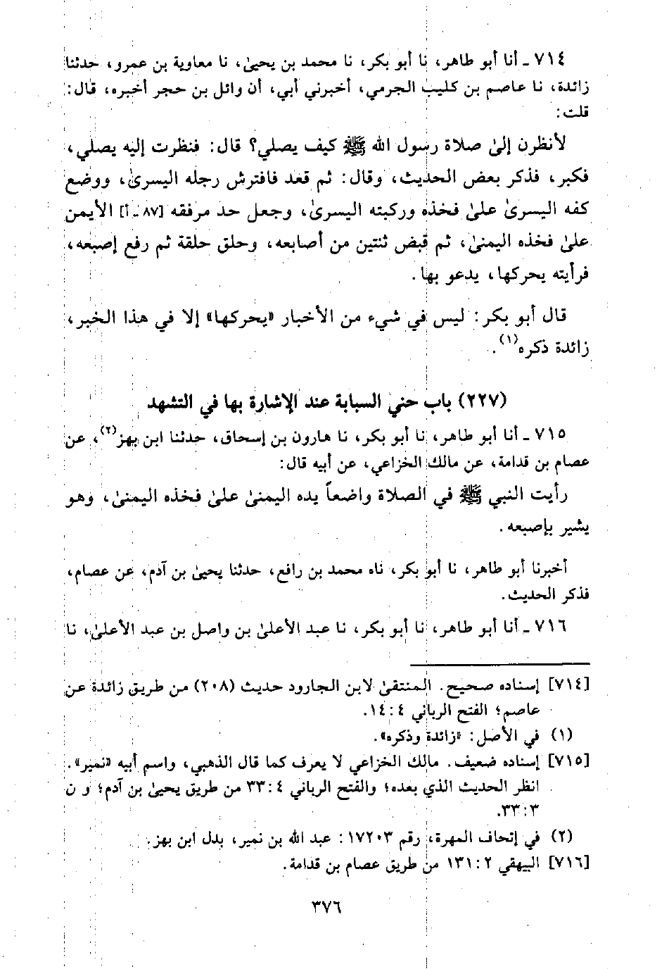 [714] إسناده صحيح. المنتقى لابن الجارود حديث (208) من طريق زائدة عن عاصم؛ الفتح الرباني 4: 14.