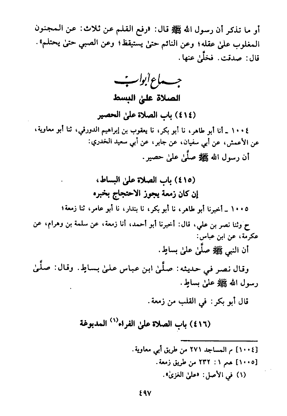 (415) بَابُ الصَّلَاةِ عَلَى الْبِسَاطِ، إِنْ كَانَ زَمْعَةُ يَجُوزُ الِاحْتِجَاجُ بِخَبَرِهِ