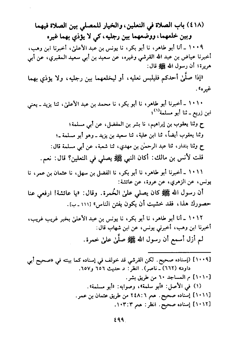 (418) بَابُ الصَّلَاةِ فِي النَّعْلَيْنِ، وَالْخِيَارِ لِلْمُصَلِّي بَيْنَ الصَّلَاةِ فِيهِمَا وَبَيْنَ خَلْعِهِمَا، وَوَضْعِهِمَا بَيْنَ رِجْلَيْهِ، كَيْ لَا يُؤْذِيَ بِهِمَا غَيْرَهُ