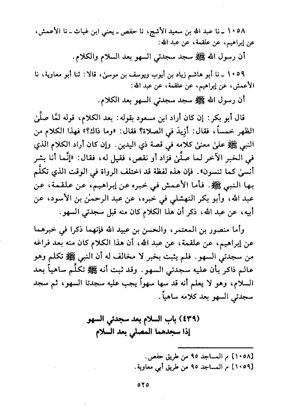 وَأَمَّا مَنْصُورُ بْنُ الْمُعْتَمِرِ، وَالْحَسَنُ بْنُ عُبَيْدِ اللَّهِ فَإِنَّهُمَا ذَكَرَا فِي خَبَرِهِمَا عَنْ إِبْرَاهِيمَ، عَنْ عَلْقَمَةَ، عَنْ عَبْدِ اللَّهِ، أَنَّ هَذَا الْكَلَامَ كَانَ مِنْهُ بَعْدَ فَرَاغِهِ مِنْ سَجْدَتَيِ السَّهْوِ. فَلَمْ يَثْبُتْ بِخَبَرٍ لَا مُخَالِفَ لَهُ أَنَّ النَّبِيَّ صَلَّى اللَّهُ عَلَيْهِ وَسَلَّمَ تَكَلَّمَ وَهُوَ عَالِمٌ ذَاكِرٌ بِأَنَّ عَلَيْهِ سَجْدَتَيِ السَّهْوِ. وَقَدْ ثَبَتَ أَنَّهُ صَلَّى اللَّهُ عَلَيْهِ وَسَلَّمَ تَكَلَّمَ سَاهِيًا بَعْدَ السَّلَامِ، وَهُوَ لَا يَعْلَمُ أَنَّهُ قَدْ سَهَا سَهْوًا يَجِبُ عَلَيْهِ سَجْدَتَا السَّهْوِ، ثُمَّ سَجَدَ سَجْدَتَيِ السَّهْوِ بَعْدَ كَلَامِهِ سَاهِيًا.