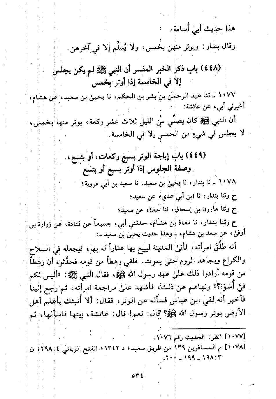 1078 - نَا بُنْدَارٌ، نَا يَحْيَى بْنُ سَعِيدٍ، نَا سَعِيدُ بْنُ أَبِي عَرُوبَةَ؛ ح وَثَنَا بُنْدَارٌ، نَا ابْنُ أَبِي عَدِيٍّ، عَنْ سَعِيدٍ؛ ح وَثَنَا هَارُونُ بْنُ إِسْحَاقَ، ثَنَا عَبْدَةُ، عَنْ سَعِيدٍ؛ ح وَثَنَا بُنْدَارٌ، نَا مُعَاذُ بْنُ هِشَامٍ، حَدَّثَنِي أَبِي، جَمِيعًا عَنْ قَتَادَةَ، عَنْ زُرَارَةَ بْنِ أَوْفَى، عَنْ سَعْدِ بْنِ هِشَامٍ، -وَهَذَا حَدِيثُ يَحْيَى بْنِ سَعِيدٍ-: