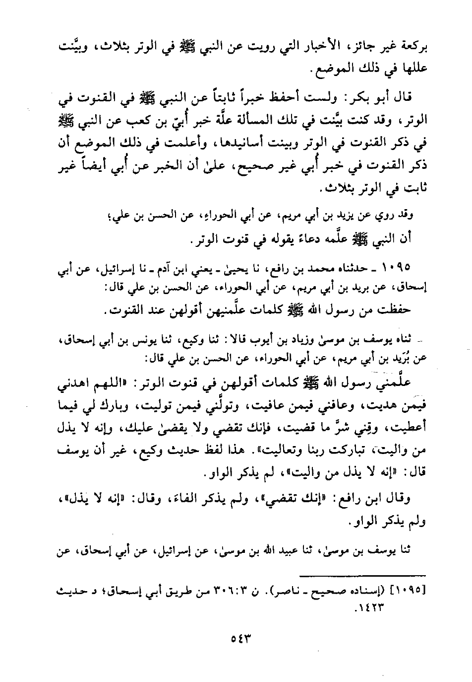 قَالَ أَبُو بَكْرٍ: وَلَسْتُ أَحْفَظُ خَبَرًا ثَابِتًا عَنِ النَّبِيِّ صَلَّى اللَّهُ عَلَيْهِ وَسَلَّمَ فِي الْقُنُوتِ فِي الْوِتْرِ، وَقَدْ كُنْتُ بَيَّنْتُ فِي تِلْكَ الْمَسْأَلَةِ عِلَّةَ خَبَرِ أُبَيِّ بْنِ كَعْبٍ عَنِ النَّبِيِّ صَلَّى اللَّهُ عَلَيْهِ وَسَلَّمَ فِي ذِكْرِ الْقُنُوتِ فِي الْوِتْرِ وَبَيَّنْتُ أَسَانِيدَهَا، وَأَعْلَمْتُ فِي ذَلِكَ الْمَوْضِعِ أَنَّ ذِكْرَ الْقُنُوتِ فِي خَبَرِ أُبَيٍّ غَيْرُ صَحِيحٍ، عَلَى أَنَّ الْخَبَرَ عَنْ أُبَيٍّ أَيْضًا غَيْرُ ثَابِتٍ فِي الْوِتْرِ بِثَلَاثٍ.