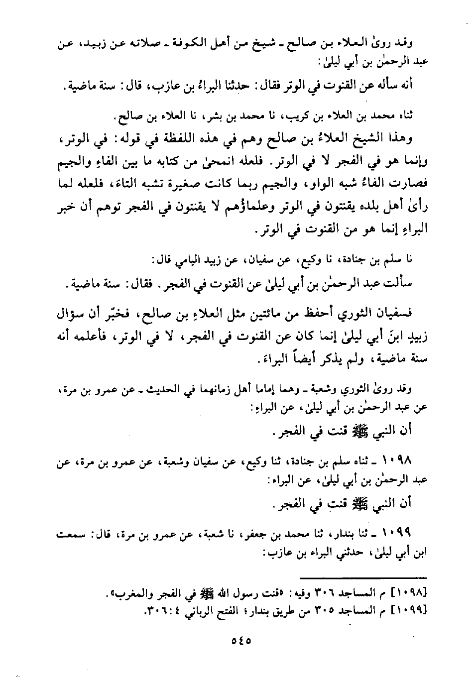 وَهَذَا الشَّيْخُ الْعَلَاءُ بْنُ صَالِحٍ وَهِمَ فِي هَذِهِ اللَّفْظَةِ فِي قَوْلِهِ: فِي الْوِتْرِ، وَإِنَّمَا هُوَ فِي الْفَجْرِ لَا فِي الْوِتْرِ. فَلَعَلَّهُ انْمَحَى مِنْ كِتَابِهِ مَا بَيْنَ الْفَاءِ وَالْجِيمِ فَصَارَتِ الْفَاءُ شِبْهَ الْوَاوِ، وَالْجِيمُ رُبَّمَا كَانَتْ صَغِيرَةً تُشْبِهُ التَّاءَ، فَلَعَلَّهُ لَمَّا رَأَى أَهْلَ بَلَدِهِ يَقْنُتُونَ فِي الْوِتْرِ وَعُلَمَاؤُهُمْ لَا يَقْنُتُونَ فِي الْفَجْرِ تَوَهَّمَ أَنَّ خَبَرَ الْبَرَاءِ إِنَّمَا هُوَ مِنَ الْقُنُوتِ فِي الْوِتْرِ.
