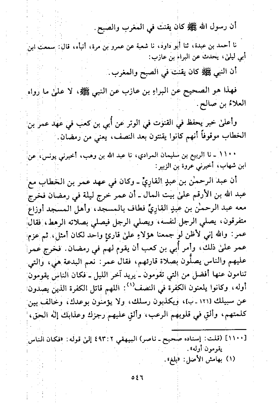 وَأَعْلَى خَبَرٍ يُحْفَظُ فِي الْقُنُوتِ فِي الْوِتْرِ عَنْ أُبَيِّ بْنِ كَعْبٍ فِي عَهْدِ عُمَرَ بْنِ الْخَطَّابِ مَوْقُوفًا أَنَّهُمْ كَانُوا يَقْنُتُونَ بَعْدَ النِّصْفِ، يَعْنِي مِنْ رَمَضَانَ.