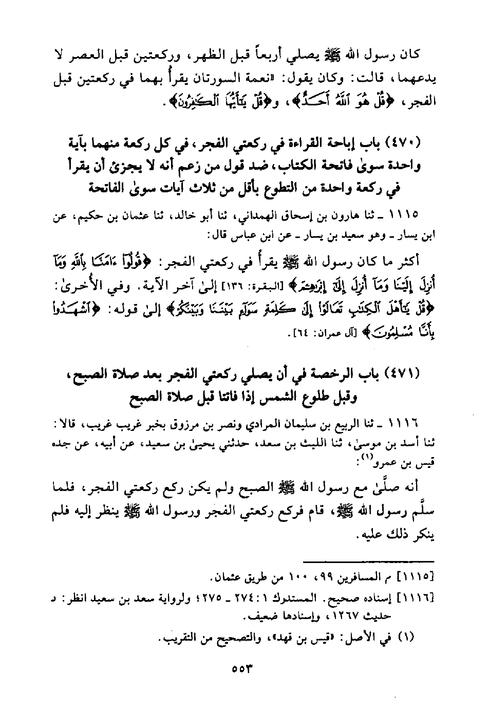 كَانَ رَسُولُ اللَّهِ صَلَّى اللَّهُ عَلَيْهِ وَسَلَّمَ يُصَلِّي أَرْبَعًا قَبْلَ الظُّهْرِ، وَرَكْعَتَيْنِ قَبْلَ الْعَصْرِ لَا يَدَعُهُمَا، قَالَتْ: وَكَانَ يَقُولُ: "نِعْمَتِ السُّورَتَانِ يُقْرَأُ بِهِمَا فِي رَكْعَتَيْنِ قَبْلَ الْفَجْرِ، (قُلْ هُوَ اللَّهُ أَحَدٌ)، وَ (قُلْ يَاأَيُّهَا الْكَافِرُونَ).