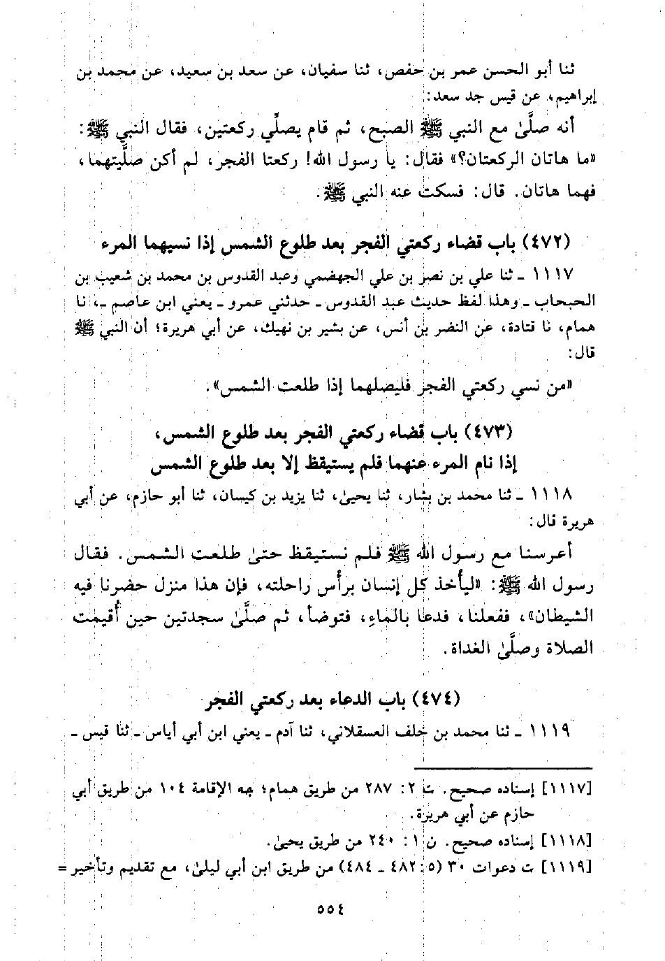1118 - ثَنَا مُحَمَّدُ بْنُ بَشَّارٍ، ثَنَا يَحْيَى، ثَنَا يَزِيدُ بْنُ كَيْسَانَ، ثَنَا أَبُو حَازِمٍ، عَنْ أَبِي هُرَيْرَةَ قَالَ: أَعْرَسْنَا مَعَ رَسُولِ اللَّهِ صَلَّى اللَّهُ عَلَيْهِ وَسَلَّمَ فَلَمْ نَسْتَيْقِظْ حَتَّى طَلَعَتِ الشَّمْسُ. فَقَالَ رَسُولُ اللَّهِ صَلَّى اللَّهُ عَلَيْهِ وَسَلَّمَ: "لِيَأْخُذْ كُلُّ إِنْسَانٍ بِرَأْسِ رَاحِلَتِهِ، فَإِنَّ هَذَا مَنْزِلٌ حَضَرَنَا فِيهِ الشَّيْطَانُ"، فَفَعَلْنَا، فَدَعَا بِالْمَاءِ، فَتَوَضَّأَ، ثُمَّ صَلَّى سَجْدَتَيْنِ حِينَ أُقِيمَتِ الصَّلَاةُ، وَصَلَّى الْغَدَاةَ.