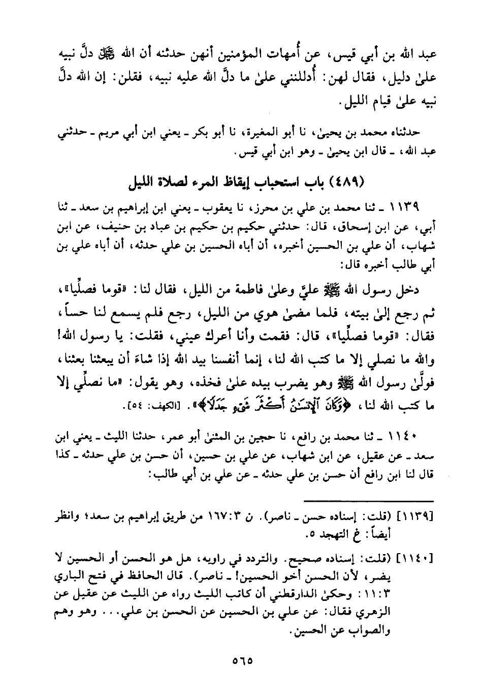 1140 - ثَنَا مُحَمَّدُ بْنُ رَافِعٍ، نَا حُجَيْنُ بْنُ الْمُثَنَّى أَبُو عمر، حَدَّثَنَا اللَّيْثُ -يَعْنِي ابْنَ سَعْدٍ- عَنْ عُقَيْلٍ، عَنِ ابْنِ شِهَابٍ، عَنْ عَلِيِّ بْنِ الْحُسَيْنِ، أَنَّ حَسَنَ بْنَ عَلِيٍّ حَدَّثَهُ -كَذَا قَالَ لَنَا ابْنُ رَافِعٍ أنَّ حَسَنَ بْنَ عَلِيٍّ حَدَّثَهُ- عَنْ عَلِيِّ بْنِ أَبِي طَالِبٍ: