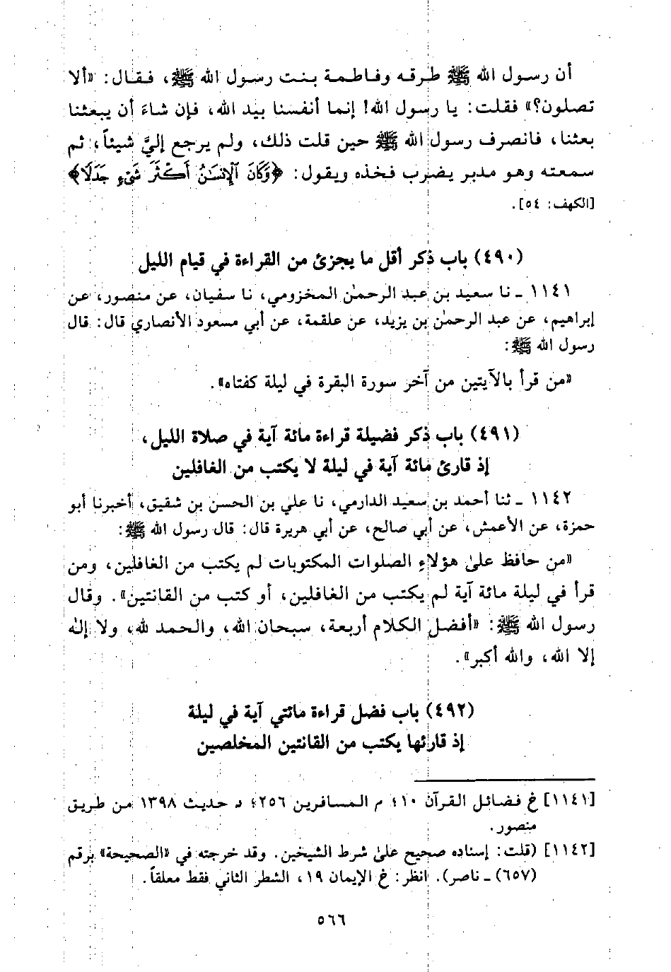 (492) بَابُ فَضْلِ قِرَاءَةِ مِائَتَيْ آيَةٍ فِي لَيْلَةٍ إِذْ قَارِئُهَا يُكْتَبُ مِنَ الْقَانِتِينَ الْمُخْلِصِينَ