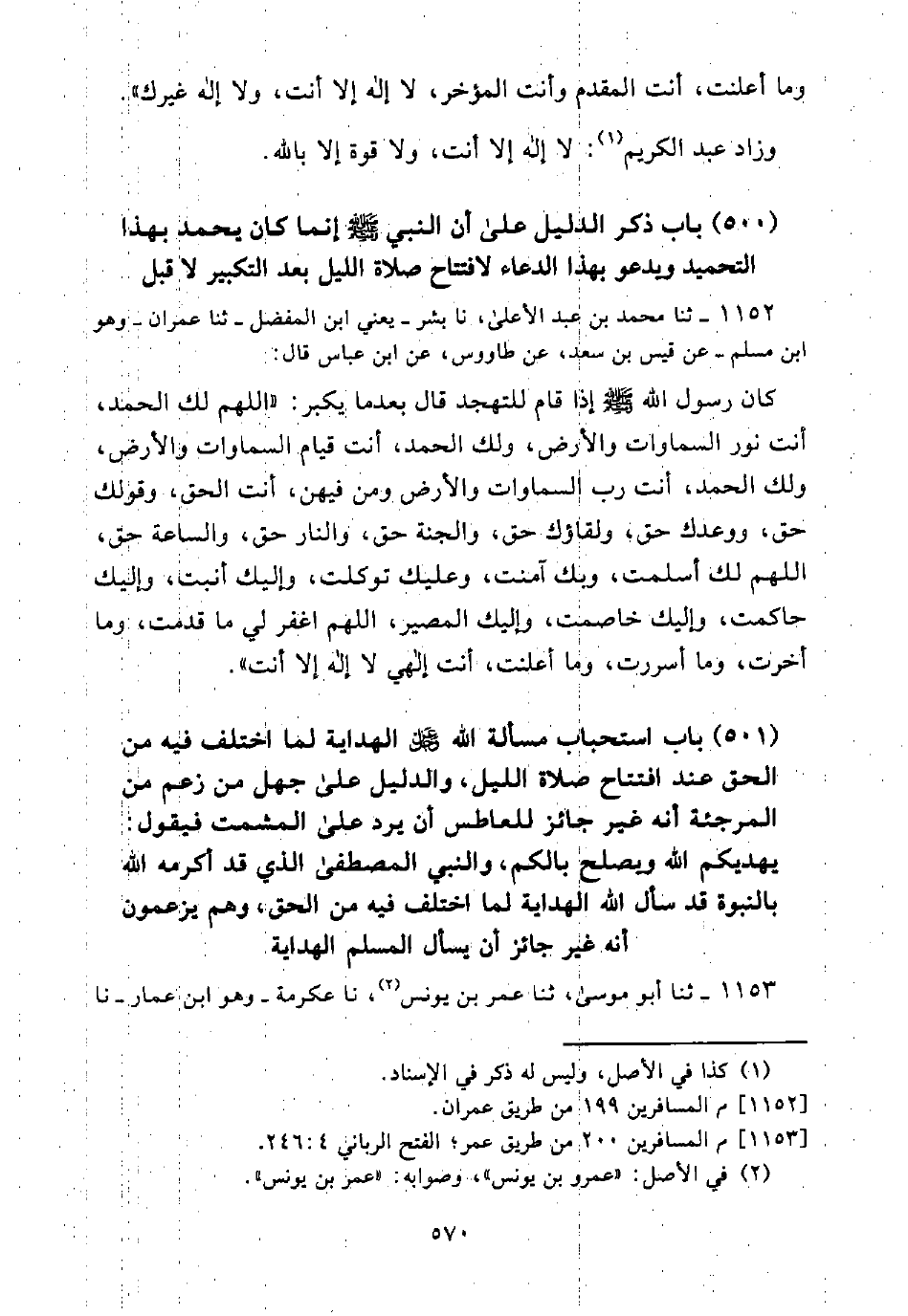 كَانَ رَسُولُ اللَّهِ صَلَّى اللَّهُ عَلَيْهِ وَسَلَّمَ إِذَا قَامَ لِلتَّهَجُّدِ قَالَ بَعْدَمَا يُكَبِّرُ: "اللَّهُمَّ لَكَ الْحَمْدُ، أَنْتَ نُورُ السَّمَاوَاتِ وَالْأَرْضِ، وَلَكَ الْحَمْدُ، أَنْتَ قَيَّامُ السَّمَاوَاتِ وَالْأَرْضِ، وَلَكَ الْحَمْدُ، أَنْتَ رَبُّ السَّمَاوَاتِ وَالْأَرْضِ وَمَنْ فِيهِنَّ، أَنْتَ الْحَقُّ، وَقَوْلُكَ حَقٌّ، وَوَعْدُكَ حَقٌّ، وَلِقَاؤُكَ حَقٌّ، وَالْجَنَّةُ حَقٌّ، وَالنَّارُ حَقٌّ، وَالسَّاعَةُ حَقٌّ، اللَّهُمَّ لَكَ أَسْلَمْتُ، وَبِكَ آمَنْتُ، وَعَلَيْكَ تَوَكَّلْتُ، وَإِلَيْكَ أَنَبْتُ، وَإِلَيْكَ حَاكَمْتُ، وَإِلَيْكَ خَاصَمْتُ، وَإِلَيْكَ الْمَصِيرُ، اللَّهُمَّ اغْفِرْ لِي مَا قَدَّمْتُ، وَمَا أَخَّرْتُ، وَمَا أَسْرَرْتُ، وَمَا أَعْلَنْتُ، أَنْتَ إِلَهِي لَا إِلَهَ إِلَّا أَنْتَ".